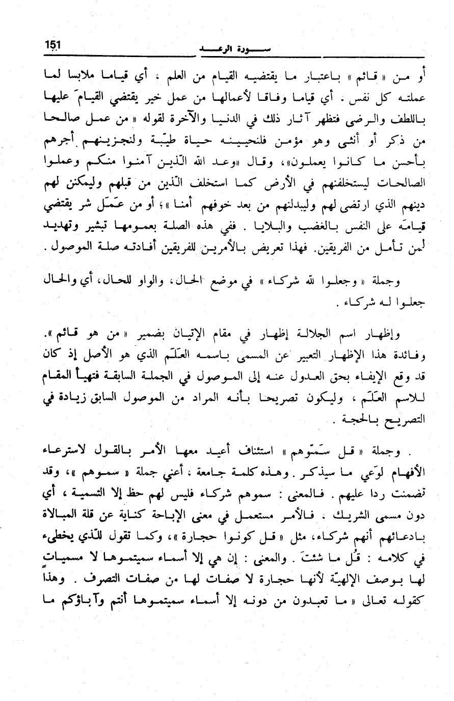 أَوْ مِنْ قائِمٌ بِاعْتِبَارِ مَا يَقْتَضِيهِ الْقِيَامُ مِنَ الْعِلْمِ، أَيْ قِيَامًا مُلَابِسًا لِمَا عَمِلَتْهُ كُلُّ نَفْسٍ، أَيْ قِيَامًا وِفَاقًا لِأَعْمَالِهَا مِنْ عَمَلِ خَيْرٍ يَقْتَضِي الْقِيَامَ عَلَيْهَا بِاللُّطْفِ وَالرِّضَى فَتَظْهَرُ آثَارُ ذَلِكَ فِي الدُّنْيَا وَالْآخِرَةِ لِقَوْلِهِ: مَنْ عَمِلَ صالِحاً مِنْ ذَكَرٍ أَوْ أُنْثى وَهُوَ مُؤْمِنٌ فَلَنُحْيِيَنَّهُ حَياةً طَيِّبَةً وَلَنَجْزِيَنَّهُمْ أَجْرَهُمْ بِأَحْسَنِ مَا كانُوا يَعْمَلُونَ [سُورَة النَّحْل: 97] ، وَقَالَ: وَعَدَ اللَّهُ الَّذِينَ آمَنُوا مِنْكُمْ وَعَمِلُوا الصَّالِحاتِ لَيَسْتَخْلِفَنَّهُمْ فِي الْأَرْضِ كَمَا اسْتَخْلَفَ الَّذِينَ مِنْ قَبْلِهِمْ وَلَيُمَكِّنَنَّ لَهُمْ دِينَهُمُ الَّذِي ارْتَضى لَهُمْ وَلَيُبَدِّلَنَّهُمْ مِنْ بَعْدِ خَوْفِهِمْ أَمْناً [سُورَة النُّور: 55] أَوْ مِنْ عَمَلِ شَرٍّ يَقْتَضِي قِيَامَهُ عَلَى النَّفْسِ بِالْغَضَبِ وَالْبَلَايَا. فَفِي هَذِهِ الصِّلَةِ بِعُمُومِهَا تَبْشِيرٌ وَتَهْدِيدٌ لِمَنْ تَأْمَّلَ مِنَ الْفَرِيقَيْنِ. فَهَذَا تَعْرِيضٌ بِالْأَمْرَيْنِ لِلْفَرِيقَيْنِ أَفَادَتْهُ صِلَةُ الْمَوْصُولِ.