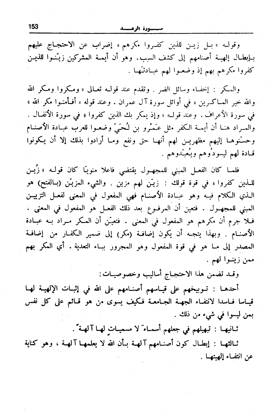 فَلَمَّا كَانَ الْفِعْلُ الْمَبْنِيُّ لِلْمَجْهُولِ يَقْتَضِي فَاعِلًا مَنْوِيًّا كَانَ قَوْلُهُ: زُيِّنَ لِلَّذِينَ كَفَرُوا فِي قُوَّةِ قَوْلِكَ: زَيَّنَّ لَهُمْ مُزَيَّنٌ. وَالشَّيْءُ الْمُزَيَّنُ (بِالْفَتْحِ) هُوَ الَّذِي الْكَلَامُ فِيهِ وَهُوَ عِبَادَةُ الْأَصْنَامِ فَهِيَ الْمَفْعُولُ فِي الْمَعْنَى لِفِعْلِ التَّزْيِينِ الْمَبْنِيِّ لِلْمَجْهُولِ، فَتَعَيَّنَ أَنَّ الْمَرْفُوعَ بَعْدَ ذَلِكَ الْفِعْلِ هُوَ الْمَفْعُولُ فِي الْمَعْنَى، فَلَا جَرَمَ أَنَّ مَكْرَهُمْ هُوَ الْمَفْعُولُ فِي الْمَعْنَى، فَتَعِيَّنَ أَنَّ الْمَكْرَ مُرَادٌ بِهِ عِبَادَةُ الْأَصْنَامِ. وَبِهَذَا يَتَّجِهُ أَنْ يَكُونَ إِضَافَةُ (مَكْرُ) إِلَى ضَمِيرِ الْكُفَّارِ مِنْ إِضَافَةِ الْمَصْدَرِ إِلَى مَا هُوَ فِي قُوَّةِ الْمَفْعُولِ وَهُوَ الْمَجْرُورُ بِبَاءِ التَّعْدِيَةِ، أَيِ الْمَكْرِ بِهِمْ مِمَّنْ زَيَّنُوا لَهُمْ.