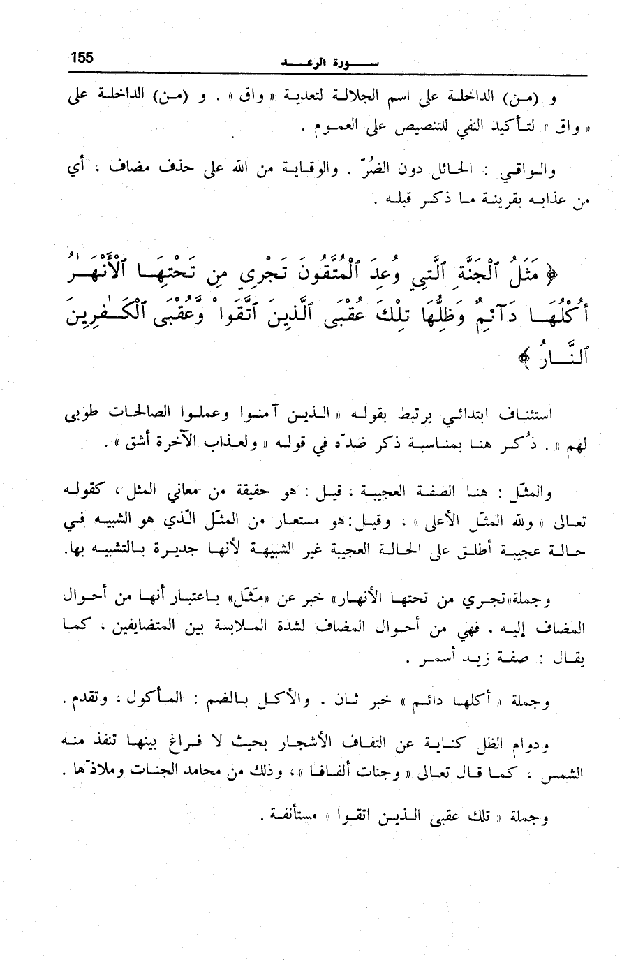 مَثَلُ الْجَنَّةِ الَّتِي وُعِدَ الْمُتَّقُونَ تَجْرِي مِنْ تَحْتِهَا الْأَنْهارُ أُكُلُها دائِمٌ وَظِلُّها تِلْكَ عُقْبَى الَّذِينَ اتَّقَوْا وَعُقْبَى الْكافِرِينَ النَّارُ (35)
