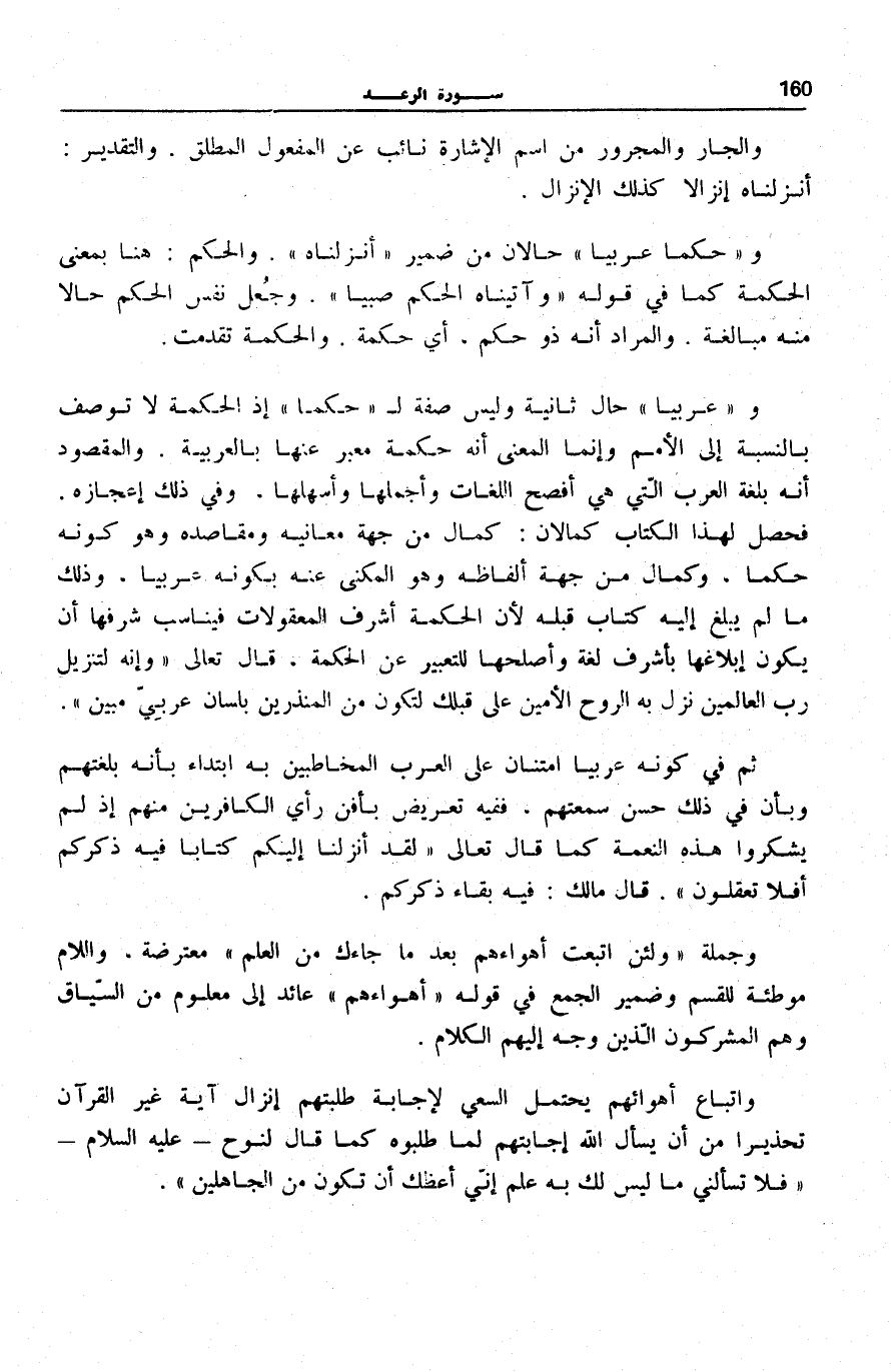 وعَرَبِيًّا حَالٌ ثَانِيَةٌ وَلَيْسَ صِفَةً لِ حُكْماً إِذِ الْحِكْمَةُ لَا تُوصَفُ بِالنِّسْبَةِ إِلَى الْأُمَمِ وَإِنَّمَا الْمَعْنَى أَنَّهُ حِكْمَةٌ مُعَبَّرٌ عَنْهَا بِالْعَرَبِيَّةِ. وَالْمَقْصُودُ أَنَّهُ بِلُغَةِ الْعَرَبِ الَّتِي هِيَ أَفْصَحُ اللُّغَاتِ وَأَجْمَلُهَا وَأَسْهَلُهَا، وَفِي ذَلِكَ إِعْجَازُهُ. فَحَصَلَ لِهَذَا الْكِتَابِ كِمَالَانِ: كَمَالٌ مِنْ جِهَةِ مَعَانِيهِ وَمَقَاصِدِهِ وَهُوَ كَوْنُهُ حُكْمًا، وَكَمَالٌ مِنْ جِهَةِ أَلْفَاظِهِ وَهُوَ الْمُكَنَّى عَنْهُ بِكَوْنِهِ عَرَبِيًّا، وَذَلِكَ مَا لَمْ يَبْلُغْ إِلَيْهِ كِتَابٌ قَبْلَهُ لِأَنَّ الْحِكْمَةَ أَشْرَفُ الْمَعْقُولَاتِ فَيُنَاسِبُ شَرَفَهَا أَنْ يَكُونَ إِبْلَاغُهَا بِأَشْرَفِ لُغَةٍ وَأَصْلَحِهَا لِلتَّعْبِيرِ عَنِ الْحِكْمَةِ، قَالَ تَعَالَى: وَإِنَّهُ لَتَنْزِيلُ رَبِّ الْعالَمِينَ نَزَلَ بِهِ الرُّوحُ الْأَمِينُ عَلى قَلْبِكَ لِتَكُونَ مِنَ الْمُنْذِرِينَ بِلِسانٍ عَرَبِيٍّ مُبِينٍ [سُورَة الشُّعَرَاء: 192- 195] .