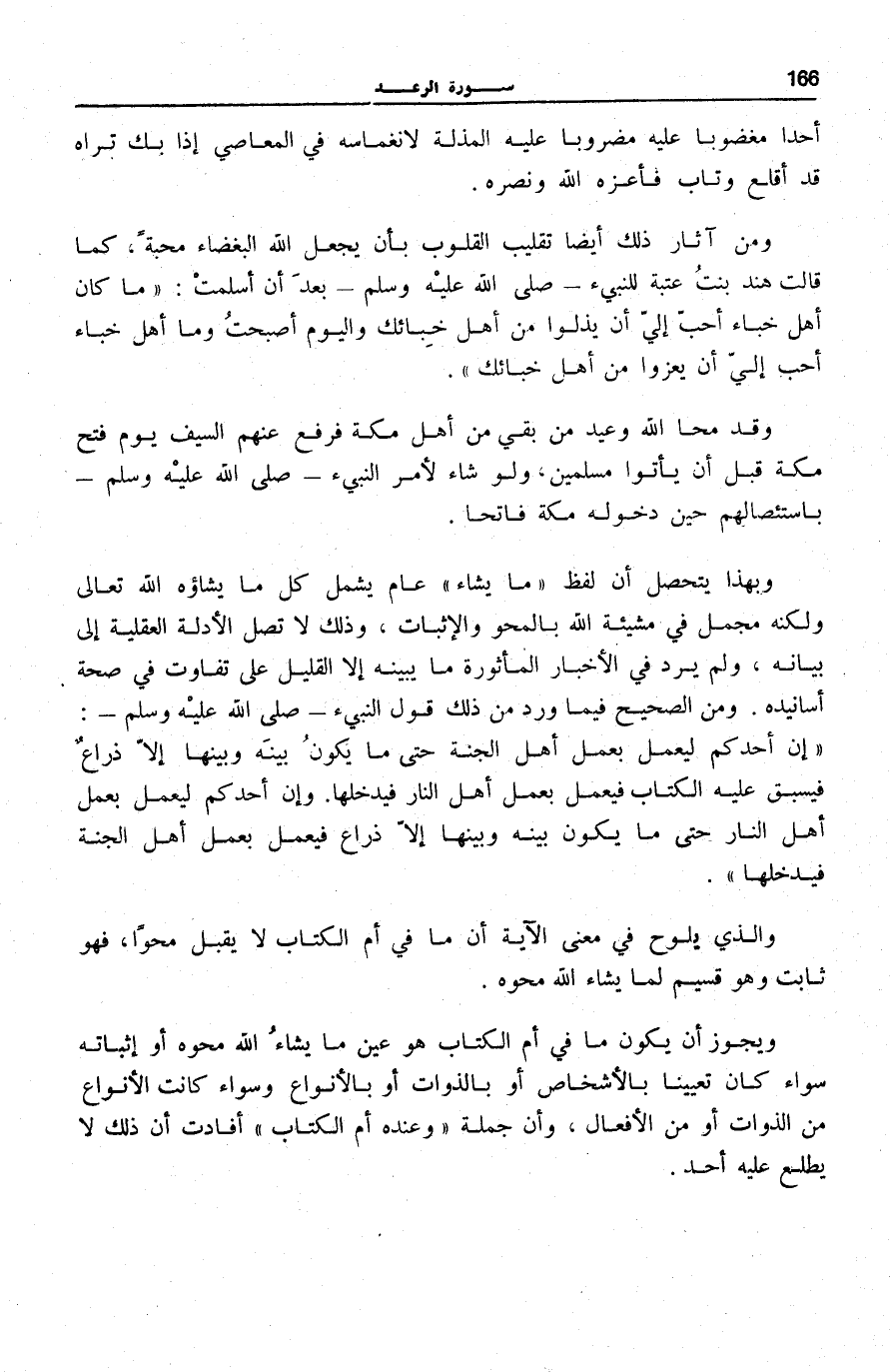 وَيَجُوزُ أَنْ يَكُونَ مَا فِي أُمِّ الْكِتَابِ هُوَ عَيْنُ مَا يَشَاءُ اللَّهُ مَحْوَهُ أَوْ إِثْبَاتَهُ سَوَاءً كَانَ تَعْيِينًا بِالْأَشْخَاصِ أَوْ بِالذَّوَاتِ أَوْ بِالْأَنْوَاعِ وَسَوَاءً كَانَتِ الْأَنْوَاعُ مِنَ الذَّوَاتِ أَوْ مِنَ الْأَفْعَالِ، وَأَنَّ جُمْلَةَ وَعِنْدَهُ أُمُّ الْكِتابِ أَفَادَتْ أَنَّ ذَلِكَ لَا يَطَّلِعُ عَلَيْهِ أَحَدٌ.