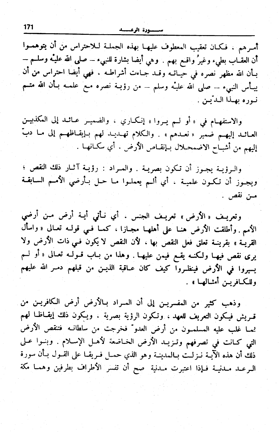 وَذَهَبَ كَثِيرٌ مِنَ الْمُفَسِّرِينَ إِلَى أَن المُرَاد ب الْأَرْضَ أَرْضُ الْكَافِرِينَ مِنْ قُرَيْشٍ فَيَكُونُ التَّعْرِيفُ لِلْعَهْدِ، وَتَكُونُ الرُّؤْيَةُ بَصَرِيَّةً، وَيَكُونُ ذَلِكَ إيقاظا لَهُم لما غَلَبَ عَلَيْهِ الْمُسْلِمُونَ مِنْ أَرْضِ الْعَدُوِّ فَخَرَجَتْ مِنْ سُلْطَانِهِ فَتَنْقُصُ الْأَرْضُ الَّتِي كَانَتْ فِي تَصَرُّفِهِمْ وَتَزِيدُ الْأَرْضُ الْخَاضِعَةُ لِأَهْلِ الْإِسْلَامِ. وَبَنَوْا عَلَى ذَلِكَ أَنَّ هَذِهِ الْآيَةَ نَزَلَتْ بِالْمَدِينَةِ وَهُوَ الَّذِي حَمَلَ فَرِيقًا عَلَى الْقَوْلِ بِأَنَّ سُورَةَ الرَّعْدِ مَدَنِيَّةٌ فَإِذَا اعْتُبِرَتْ مَدَنِيَّةً صَحَّ أَنْ تُفَسَّرَ الْأَطْرَافُ بِطَرَفَيْنِ وَهَمَا مَكَّةُ