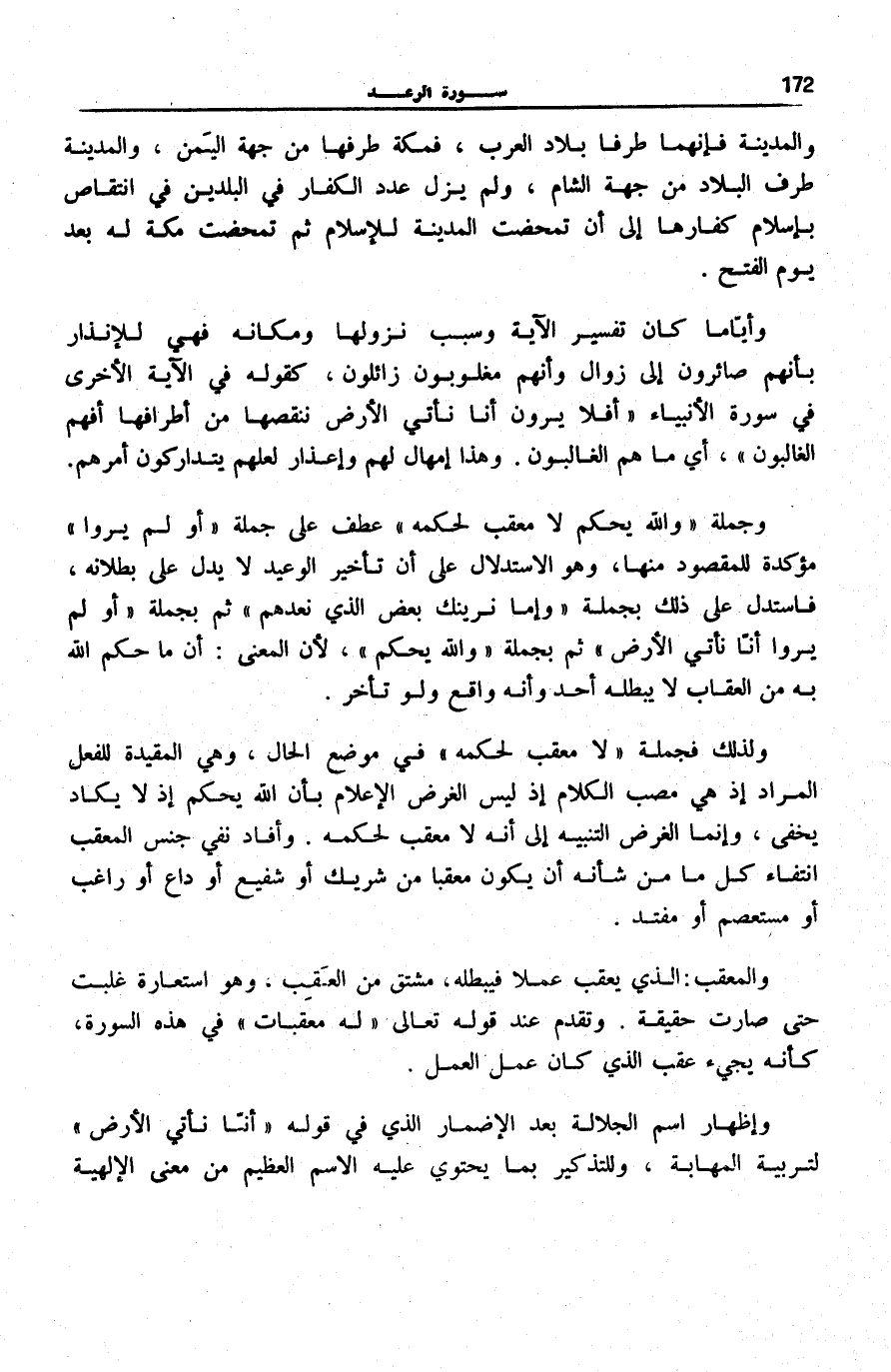 وَجُمْلَةُ وَاللَّهُ يَحْكُمُ لَا مُعَقِّبَ لِحُكْمِهِ [سُورَة الرَّعْد: 41] عَطْفٌ عَلَى جُمْلَةِ أَوَلَمْ يَرَوْا أَنَّا مُؤَكِّدَةً لِلْمَقْصُودِ مِنْهَا، وَهُوَ الِاسْتِدْلَالُ عَلَى أَنَّ تَأْخِيرَ الْوَعِيدِ لَا يَدُلُّ عَلَى بُطْلَانِهِ، فَاسْتَدَلَّ عَلَى ذَلِكَ بِجُمْلَةِ وَإِمَّا نُرِيَنَّكَ بَعْضَ الَّذِي نَعِدُهُمْ ثُمَّ بِجُمْلَةِ أَوَلَمْ يَرَوْا أَنَّا نَأْتِي الْأَرْضَ ثُمَّ بِجُمْلَةِ وَاللَّهُ يَحْكُمُ، لِأَنَّ الْمَعْنَى: أَنَّ مَا حَكَمَ اللَّهُ بِهِ مِنَ الْعِقَابِ لَا يُبْطِلُهُ أَحَدٌ وَأَنَّهُ وَاقِعٌ وَلَوْ تَأَخَّرَ.