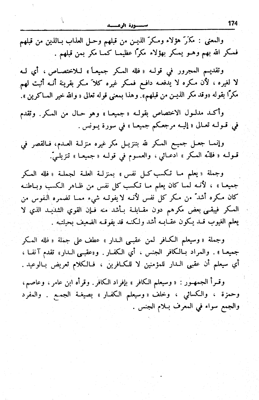 وَإِنَّمَا جُعِلَ جَمِيعُ الْمَكْرِ لِلَّهِ بِتَنْزِيلِ مَكْرِ غَيْرِهِ مَنْزِلَةَ الْعَدَمِ، فَالْقَصْرُ فِي قَوْلِهِ: فَلِلَّهِ الْمَكْرُ ادِّعَائِيٌّ، وَالْعُمُومُ فِي قَوْلِهِ: جَمِيعاً تَنْزِيلِيٌّ.