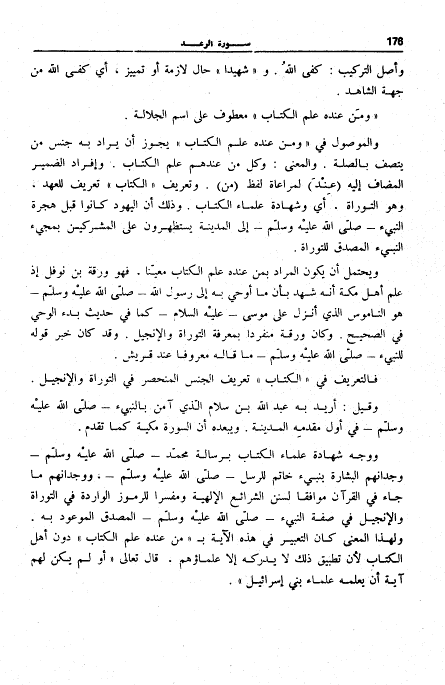 وَالْمَعْنَى: وَكُلُّ مَنْ عِنْدَهُمْ عِلْمُ الْكِتَابِ. وَإِفْرَادُ الضَّمِيرِ الْمُضَافِ إِلَيْهِ عِنْدَ لِمُرَاعَاةِ لَفْظِ مَنْ. وَتَعْرِيفُ الْكِتابِ تَعْرِيفٌ لِلْعَهْدِ، وَهُوَ التَّوْرَاةُ، أَيْ وَشَهَادَةُ عُلَمَاءِ الْكِتَابِ.