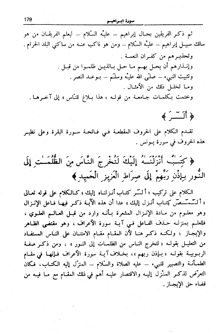 الر كِتابٌ أَنْزَلْناهُ إِلَيْكَ لِتُخْرِجَ النَّاسَ مِنَ الظُّلُماتِ إِلَى النُّورِ بِإِذْنِ رَبِّهِمْ إِلى صِراطِ الْعَزِيزِ الْحَمِيدِ (1)