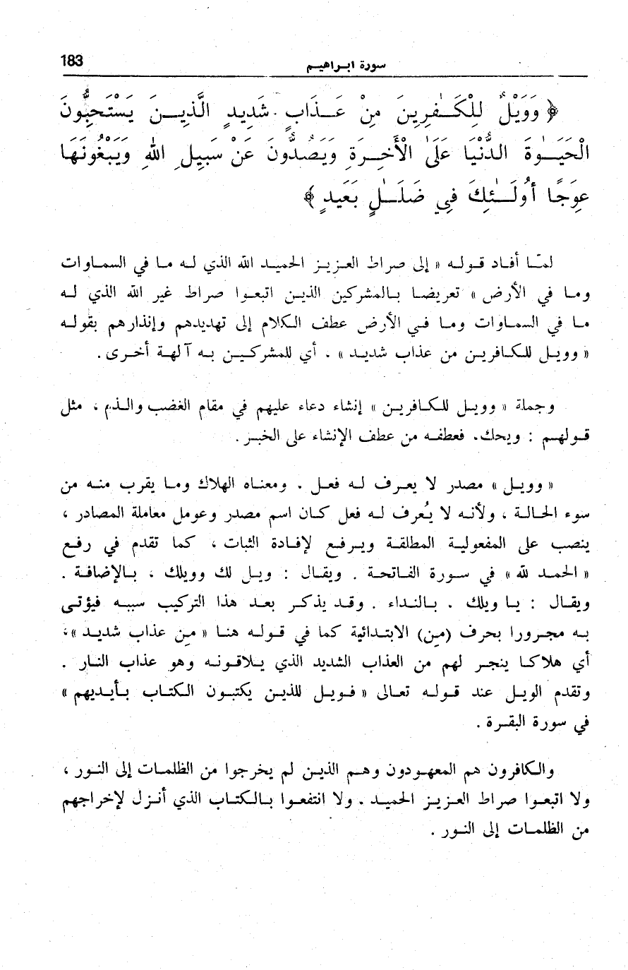 لَمَّا أَفَادَ قَوْلُهُ: إِلى صِراطِ الْعَزِيزِ الْحَمِيدِ اللَّهِ الَّذِي لَهُ مَا فِي السَّماواتِ وَما فِي الْأَرْضِ تَعْرِيضًا بِالْمُشْرِكِينَ الَّذِينَ اتَّبَعُوا صِرَاطَ غَيْرِ اللَّهِ الَّذِي لَهُ مَا فِي السَّمَاوَاتِ وَمَا فِي الْأَرْضِ عُطِفَ الْكَلَامُ إِلَى تَهْدِيدِهِمْ وَإِنْذَارِهِمْ بِقَوْلِهِ: وَوَيْلٌ لِلْكافِرِينَ مِنْ عَذابٍ شَدِيدٍ، أَيْ لِلْمُشْرِكِينَ بِهِ آلِهَةً أُخْرَى.