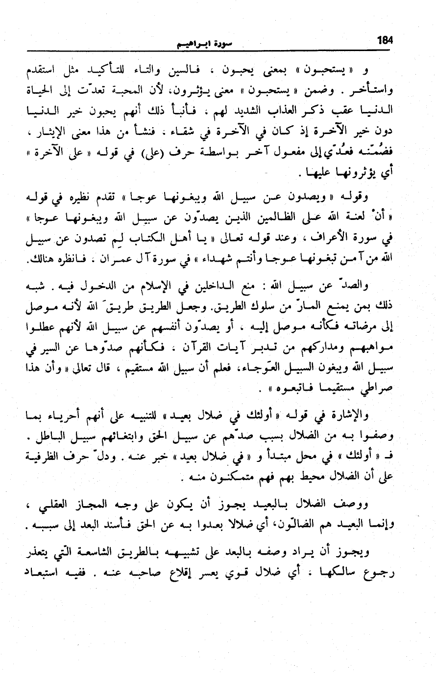 وَ (يَسْتَحِبُّونَ) بِمَعْنَى يُحِبُّونَ، فَالسِّينُ وَالتَّاءُ لِلتَّأْكِيدِ مِثْلَ اسْتَقْدَمَ واستأخر. وَضُمِّنَ يَسْتَحِبُّونَ مَعْنَى يُؤْثِرُونَ، لِأَنَّ الْمَحَبَّةَ تَعَدَّتْ إِلَى الْحَيَاةِ الدُّنْيَا عَقِبَ ذِكْرِ الْعَذَابِ الشَّدِيدِ لَهُمْ، فَأَنْبَأَ ذَلِكَ أَنَّهُمْ يُحِبُّونَ خَيْرَ الدُّنْيَا دُونَ خَيْرِ الْآخِرَةِ إِذْ كَانَ فِي الْآخِرَةِ فِي شَقَاءٍ، فَنَشَأَ مِنْ هَذَا مَعْنَى الْإِيثَارِ، فَضَمَّنَهُ فَعُدِّيَ إِلَى مَفْعُولٍ آخَرَ بِوَاسِطَةِ حَرْفِ عَلَى فِي قَوْلِهِ: