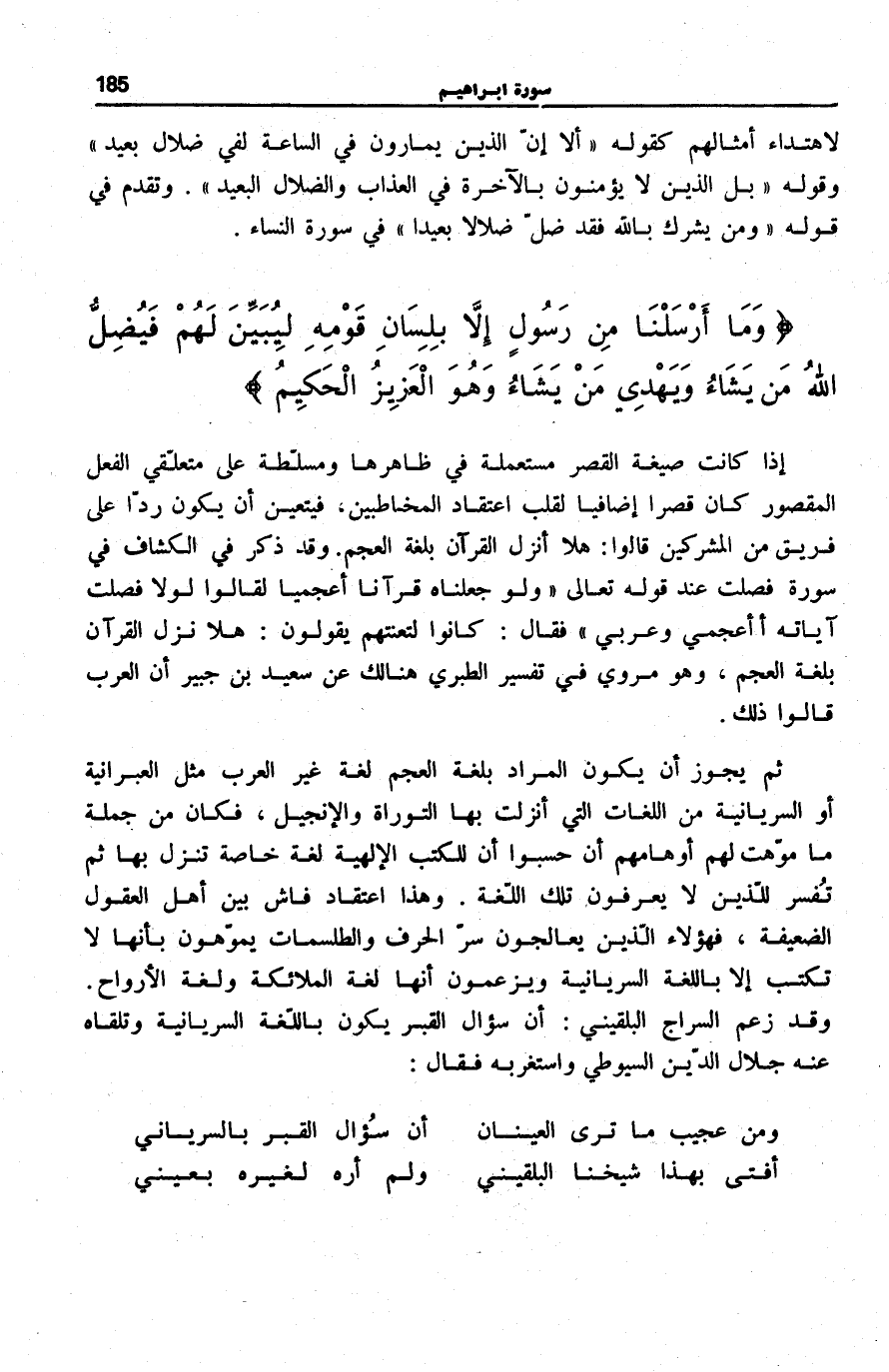 اللُّغَاتِ الَّتِي أُنْزِلَتْ بِهَا التَّوْرَاةُ وَالْإِنْجِيلُ، فَكَانَ مِنْ جملَة مَا موّت لَهُمْ أَوْهَامُهُمْ أَنْ حَسِبُوا أَن للكتب بالإلهية لُغَةً خَاصَّةً تُنَزَّلُ بِهَا ثُمَّ تُفَسَّرُ لِلَّذِينِ لَا يَعْرِفُونَ تِلْكَ اللُّغَةَ. وَهَذَا اعْتِقَادٌ فَاشٍ بَيْنَ أَهْلِ الْعُقُولِ الضَّعِيفَةِ، فَهَؤُلَاءِ الَّذِينَ يُعَالِجُونَ سِرَّ الْحَرْفِ وَالطَّلْسَمَاتِ يُمَوِّهُونَ بِأَنَّهَا لَا تكْتب إِلَّا بِاللُّغَةِ السُّرْيَانِيَّةِ وَيَزْعُمُونَ أَنَّهَا لُغَةُ الْمَلَائِكَةِ وَلُغَةُ الْأَرْوَاحِ. وَقَدْ زَعَمَ السِّرَاجُ الْبَلْقِينِيُّ: أَنَّ سُؤَالَ الْقَبْرِ يَكُونُ بِاللُّغَةِ السُّرْيَانِيَّةِ وَتَلَقَّاهُ عَنْهُ جَلَالُ الدِّينِ السُّيُوطِيُّ وَاسْتَغْرَبَهُ فَقَالَ:
