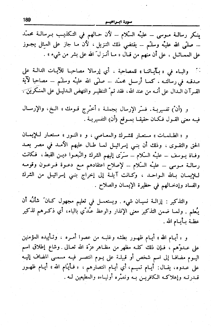 والظُّلُماتِ مُسْتَعَارٌ لِلشِّرْكِ وَالْمَعَاصِي، والنُّورِ مُسْتَعَارٌ لِلْإِيمَانِ الْحَقِّ وَالتَّقْوَى، وَذَلِكَ أَنَّ بَنِي إِسْرَائِيلَ لَمَّا طَالَ عَلَيْهِمُ الْأَمَدُ فِي مِصْرَ بَعْدَ وَفَاةِ يُوسُفَ- عَلَيْهِ السَّلَامُ-