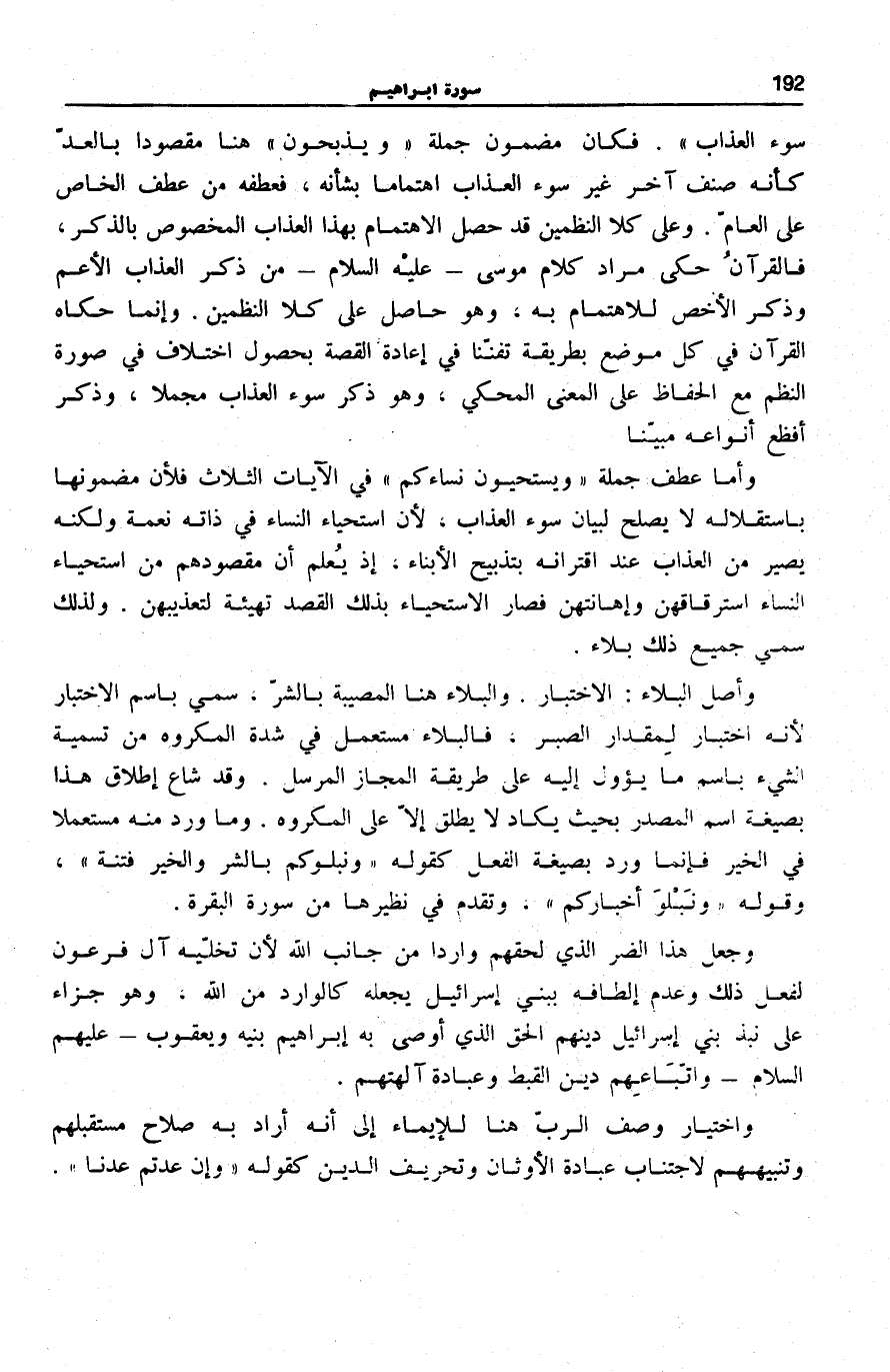 سُوءَ الْعَذابِ. فَكَانَ مَضْمُونُ جُمْلَةِ وَيُذَبِّحُونَ هُنَا مَقْصُودًا بِالْعَدِّ كَأَنَّهُ صِنْفٌ آخَرُ غَيْرُ سُوءِ الْعَذَابِ اهْتِمَامًا بِشَأْنِهِ، فَعَطْفُهُ مِنْ عَطْفِ الْخَاصِّ عَلَى الْعَامِّ. وَعَلَى