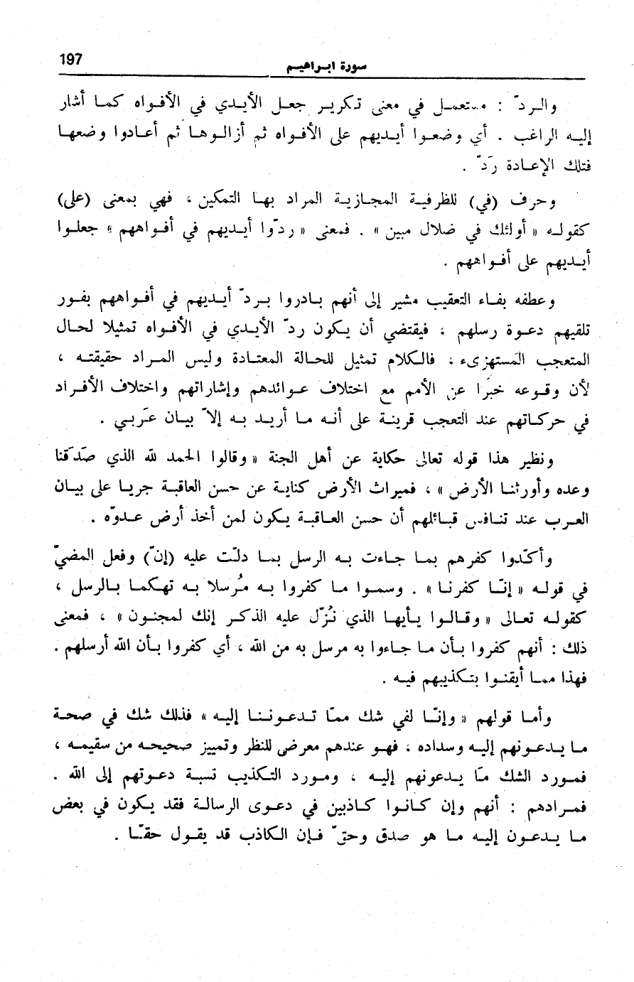 وَالرَّدُّ: مُسْتَعْمَلٌ فِي مَعْنَى تَكْرِيرِ جَعْلِ الْأَيْدِي فِي الْأَفْوَاهِ كَمَا أَشَارَ إِلَيْهِ «الرَّاغِبُ» .
