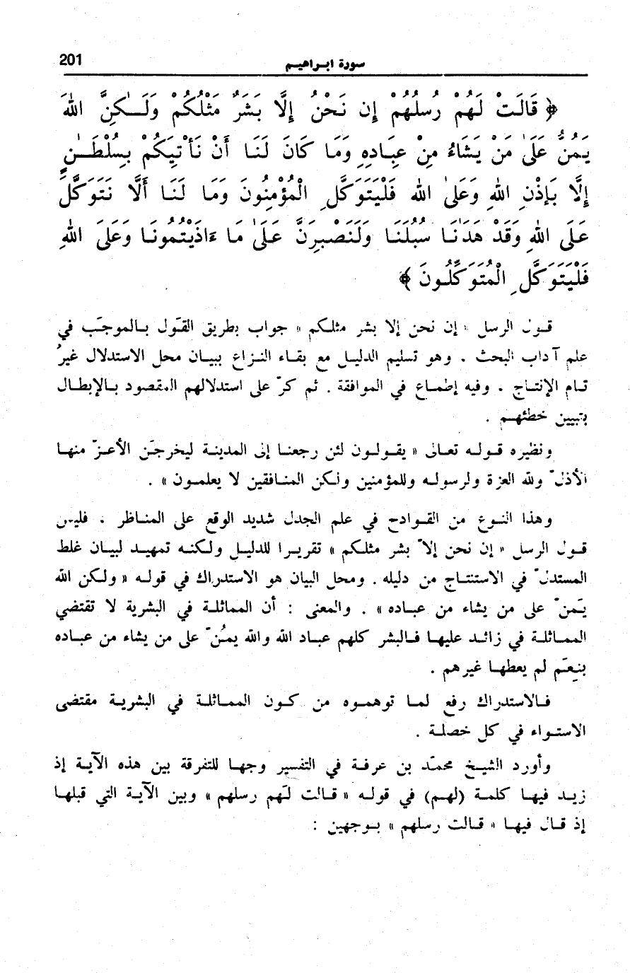 قالَتْ لَهُمْ رُسُلُهُمْ إِنْ نَحْنُ إِلاَّ بَشَرٌ مِثْلُكُمْ وَلكِنَّ اللَّهَ يَمُنُّ عَلى مَنْ يَشاءُ مِنْ عِبادِهِ وَما كانَ لَنا أَنْ نَأْتِيَكُمْ بِسُلْطانٍ إِلاَّ بِإِذْنِ اللَّهِ وَعَلَى اللَّهِ فَلْيَتَوَكَّلِ الْمُؤْمِنُونَ (11) وَما لَنا أَلاَّ نَتَوَكَّلَ عَلَى اللَّهِ وَقَدْ هَدانا سُبُلَنا وَلَنَصْبِرَنَّ عَلى مَا آذَيْتُمُونا وَعَلَى اللَّهِ فَلْيَتَوَكَّلِ الْمُتَوَكِّلُونَ (12)