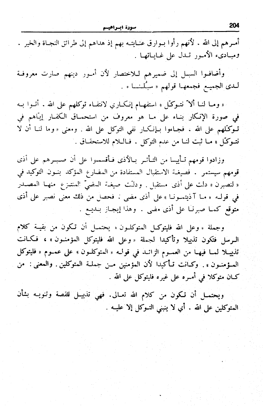 وَجُمْلَةُ وَعَلَى اللَّهِ فَلْيَتَوَكَّلِ الْمُتَوَكِّلُونَ يُحْتَمَلُ أَنْ تَكُونَ مِنْ بَقِيَّةِ كَلَامِ الرُّسُلِ فَتَكُونَ تَذْيِيلًا وَتَأْكِيدًا لِجُمْلَةِ وَعَلَى اللَّهِ فَلْيَتَوَكَّلِ الْمُؤْمِنُونَ فَكَانَتْ تَذْيِيلًا لِمَا فِيهَا مِنَ الْعُمُومِ الزَّائِدِ فِي قَوْلِهِ: الْمُتَوَكِّلُونَ عَلَى عُمُومِ فَلْيَتَوَكَّلِ الْمُؤْمِنُونَ. وَكَانَتْ تَأْكِيدًا لِأَنَّ الْمُؤْمِنِينَ مِنْ جُمْلَةِ الْمُتَوَكِّلِينَ. وَالْمَعْنَى: مَنْ كَانَ مُتَوَكِّلًا فِي أَمْرِهِ عَلَى غَيْرِهِ فَلْيَتَوَكَّلْ عَلَى اللَّهِ.