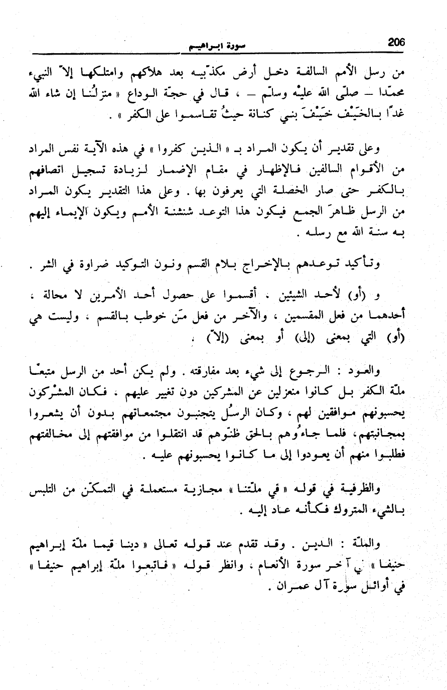 . وَعَلَى تَقْدِيرِ أَنْ يَكُونَ الْمُرَادُ بِ الَّذِينَ كَفَرُوا فِي هَذِهِ الْآيَةِ نَفْسَ الْمُرَادِ مِنَ الْأَقْوَامِ السَّالِفَيْنِ فَالْإِظْهَارُ فِي مَقَامِ الْإِضْمَارِ لِزِيَادَةِ تَسْجِيلِ اتِّصَافِهِمْ بِالْكُفْرِ حَتَّى صَارَ الْخَصْلَةَ الَّتِي يُعْرَفُونَ بِهَا. وَعَلَى هَذَا التَّقْدِيرِ يَكُونُ الْمُرَادُ مِنَ الرُّسُلِ ظَاهِرَ الْجَمْعِ فَيَكُونُ هَذَا التوعد سنة الْأُمَمِ وَيَكُونُ الْإِيمَاءُ إِلَيْهِمْ بِهِ سُنَّةَ اللَّهِ مَعَ رُسُلِهِ.