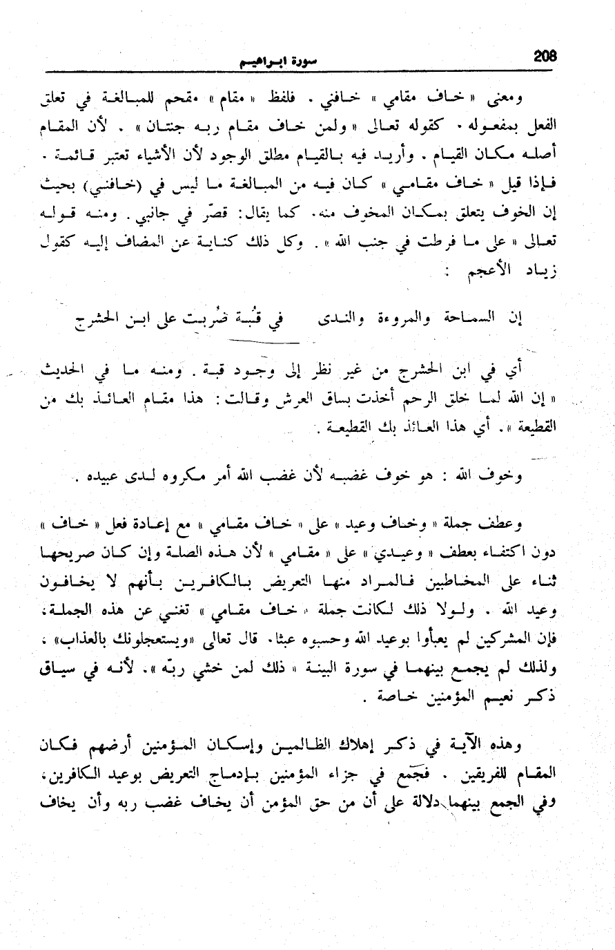 وَمَعْنَى خافَ مَقامِي خَافَنِي، فَلَفْظُ مَقَامٍ مُقْحِمٌ لِلْمُبَالَغَةِ فِي تَعَلُّقِ الْفِعْلِ بِمَفْعُولِهِ، كَقَوْلِهِ تَعَالَى: وَلِمَنْ خافَ مَقامَ رَبِّهِ جَنَّتانِ [الرَّحْمَن: 46] ، لِأَنَّ الْمَقَامَ أَصْلُهُ مَكَانُ الْقِيَامِ، وَأُرِيدَ فِيهِ بِالْقِيَامِ مُطْلَقُ الْوُجُودِ لِأَنَّ الْأَشْيَاءَ تُعْتَبَرُ قَائِمَةً، فَإِذَا قِيلَ خافَ مَقامِي كَانَ فِيهِ مِنَ الْمُبَالَغَةِ مَا لَيْسَ فِي (خَافَنِي) بِحَيْثُ إِنَّ الْخَوْفَ يَتَعَلَّقُ بِمَكَانِ الْمُخَوَّفِ مِنْهُ. كَمَا يُقَالُ: قَصَّرَ فِي جَانِبِي. وَمِنْهُ قَوْلُهُ تَعَالَى: عَلى مَا فَرَّطْتُ فِي جَنْبِ اللَّهِ [سُورَة الزمر: 56] . وَكُلُّ ذَلِكَ كِنَايَةٌ عَنِ الْمُضَافِ إِلَيْهِ كَقَوْلِ زِيَادٍ الْأَعْجَمِ: