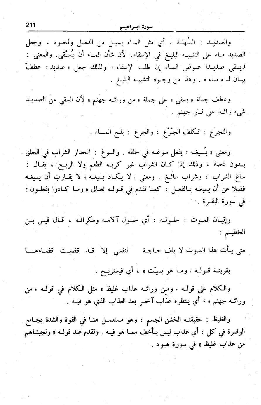 وَالصَّدِيدُ: الْمُهْلَةُ، أَيْ مِثْلُ الْمَاءِ يَسِيلُ مِنَ الدُّمَّلِ وَنَحْوِهِ، وَجَعَلَ الصَّدِيدَ مَاءً عَلَى التَّشْبِيهِ الْبَلِيغِ فِي الْإِسْقَاءِ، لِأَنَّ شَأْنَ الْمَاءِ أَنْ يُسْقَى. وَالْمَعْنَى: وَيُسْقَى صَدِيدًا عِوَضَ الْمَاءِ إِنْ طَلَبَ الْإِسْقَاءَ، وَلذَلِك جعل صَدِيدٍ عَطْفَ بَيَانٍ لِ ماءٍ. وَهَذَا مِنْ وُجُوهِ التَّشْبِيهِ الْبَلِيغِ.