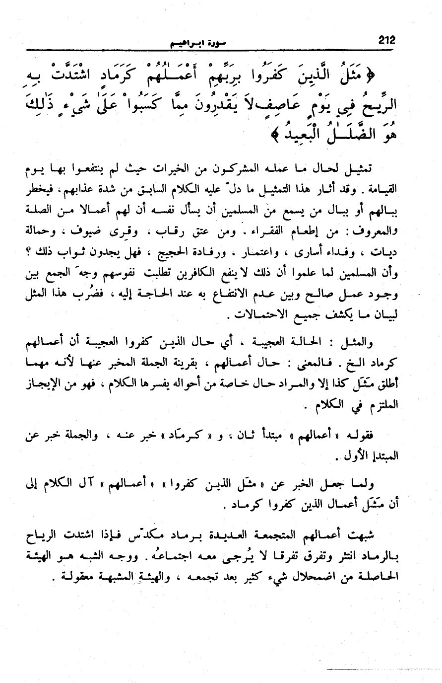 مَثَلُ الَّذِينَ كَفَرُوا بِرَبِّهِمْ أَعْمالُهُمْ كَرَمادٍ اشْتَدَّتْ بِهِ الرِّيحُ فِي يَوْمٍ عاصِفٍ لَا يَقْدِرُونَ مِمَّا كَسَبُوا عَلى شَيْءٍ ذلِكَ هُوَ الضَّلالُ الْبَعِيدُ (18)