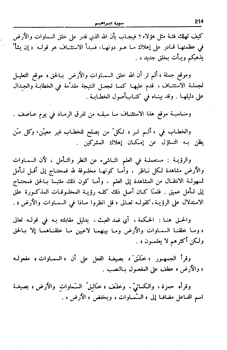 وَمَوْقِعُ جُمْلَةِ أَلَمْ تَرَ أَنَّ اللَّهَ خَلَقَ السَّماواتِ وَالْأَرْضَ بِالْحَقِّ مُوقِعُ التَّعْلِيلِ لِجُمْلَةِ الِاسْتِئْنَافِ، قُدِّمَ عَلَيْهَا كَمَا تَجْعَلُ النَّتِيجَةَ مُقَدَّمَةً فِي الْخَطَابَةِ وَالْجِدَالِ عَلَى دَلِيلِهَا. وَقَدْ بَيَّنَاهُ فِي كِتَابِ «أُصُولِ الْخَطَابَةِ» .