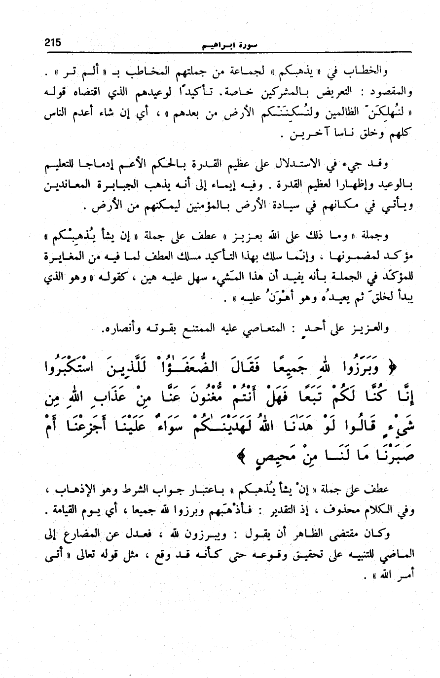 وَقَدْ جِيءَ فِي الِاسْتِدْلَالِ عَلَى عَظِيمِ الْقُدْرَةِ بِالْحُكْمِ الْأَعَمِّ إِدْمَاجًا لِلتَّعْلِيمِ بِالْوَعِيدِ وَإِظْهَارًا لِعَظِيمِ الْقُدْرَةِ. وَفِيهِ إِيمَاءٌ إِلَى أَنَّهُ يُذْهِبُ الْجَبَابِرَةَ الْمُعَانِدِينَ وَيَأْتِي فِي مَكَانِهِمْ فِي سِيَادَةِ الْأَرْضِ بِالْمُؤْمِنِينَ ليمكنهم من الْأَرْضِ.
