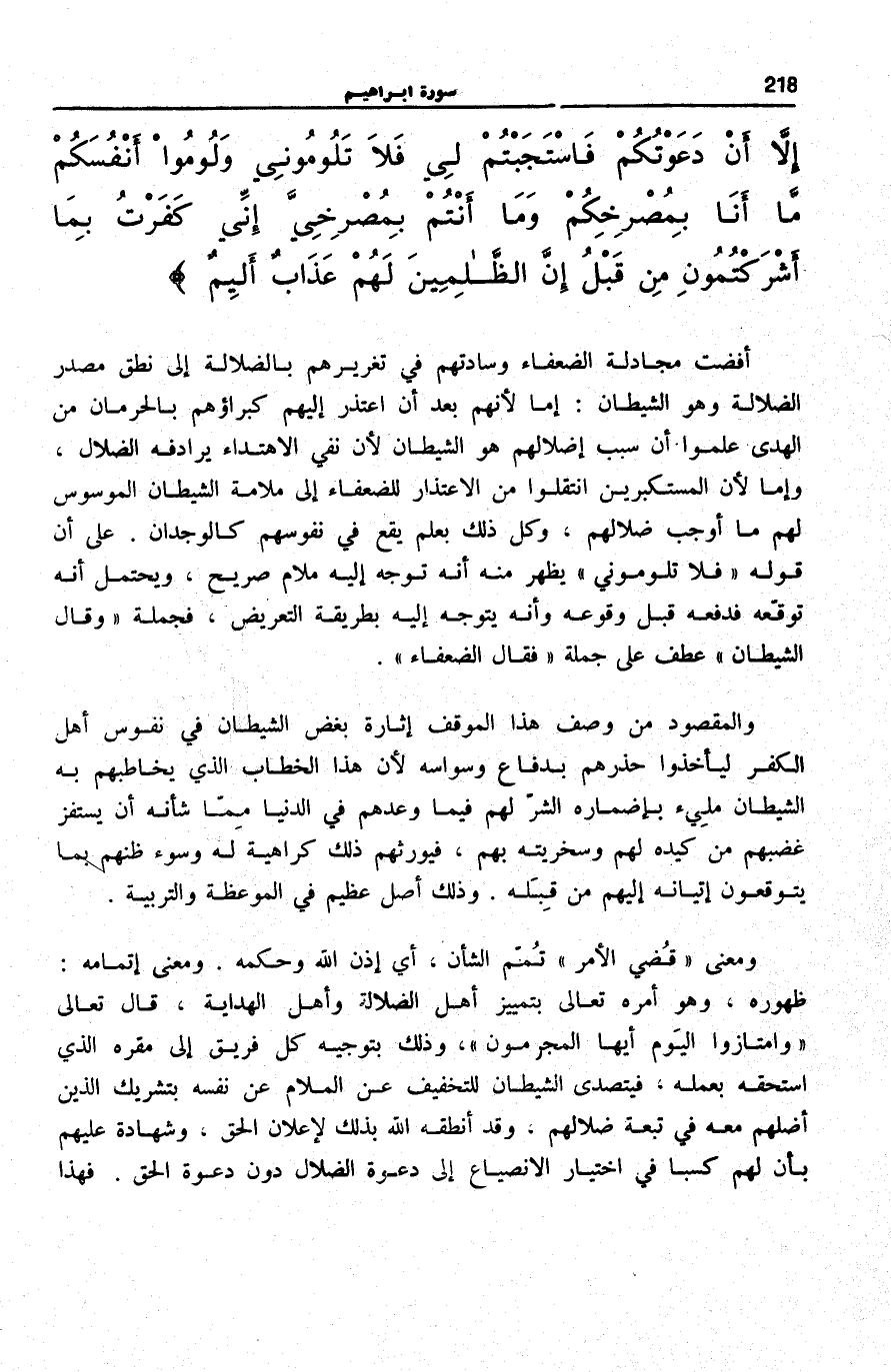 وَقالَ الشَّيْطانُ لَمَّا قُضِيَ الْأَمْرُ إِنَّ اللَّهَ وَعَدَكُمْ وَعْدَ الْحَقِّ وَوَعَدْتُكُمْ فَأَخْلَفْتُكُمْ وَما كانَ لِي عَلَيْكُمْ مِنْ سُلْطانٍ إِلاَّ أَنْ دَعَوْتُكُمْ فَاسْتَجَبْتُمْ لِي فَلا تَلُومُونِي وَلُومُوا أَنْفُسَكُمْ مَا أَنَا بِمُصْرِخِكُمْ وَما أَنْتُمْ بِمُصْرِخِيَّ إِنِّي كَفَرْتُ بِما أَشْرَكْتُمُونِ مِنْ قَبْلُ إِنَّ الظَّالِمِينَ لَهُمْ عَذابٌ أَلِيمٌ (22)