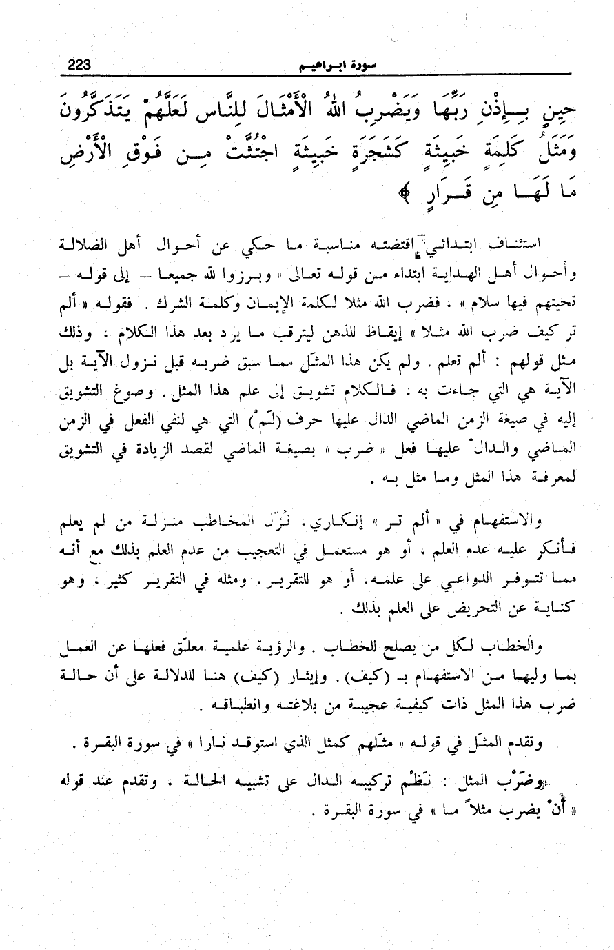أَلَمْ تَرَ كَيْفَ ضَرَبَ اللَّهُ مَثَلاً كَلِمَةً طَيِّبَةً كَشَجَرَةٍ طَيِّبَةٍ أَصْلُها ثابِتٌ وَفَرْعُها فِي السَّماءِ (24) تُؤْتِي أُكُلَها كُلَّ حِينٍ بِإِذْنِ رَبِّها وَيَضْرِبُ اللَّهُ الْأَمْثالَ لِلنَّاسِ لَعَلَّهُمْ يَتَذَكَّرُونَ (25) وَمَثَلُ كَلِمَةٍ خَبِيثَةٍ كَشَجَرَةٍ خَبِيثَةٍ اجْتُثَّتْ مِنْ فَوْقِ الْأَرْضِ مَا لَها مِنْ قَرارٍ (26)