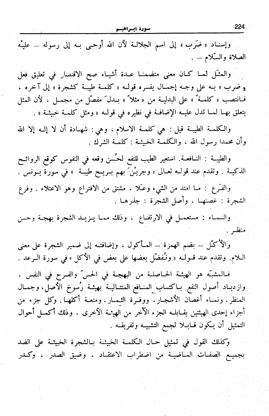 وَالْمَثَلُ لَمَّا كَانَ مَعْنًى مُتَضَمِّنًا عِدَّةَ أَشْيَاءَ صَحَّ الِاقْتِصَارُ فِي تَعْلِيقِ فِعْلِ ضَرَبَ بِهِ عَلَى وَجْهِ إِجْمَالٍ يُفَسِّرُهُ قَوْلُهُ: كَلِمَةً طَيِّبَةً كَشَجَرَةٍ إِلَى آخِرِهِ، فَانْتَصَبَ كَلِمَةً عَلَى الْبَدَلِيَّةِ مِنْ مَثَلًا بَدَلٌ مُفَصَّلٌ مِنْ مُجْمَلٍ، لِأَنَّ الْمَثَلَ يَتَعَلَّقُ بِهَا لِمَا تَدُلُّ عَلَيْهِ الْإِضَافَةُ فِي نَظِيرِهِ فِي قَوْلِهِ: وَمَثَلُ كَلِمَةٍ خَبِيثَةٍ.