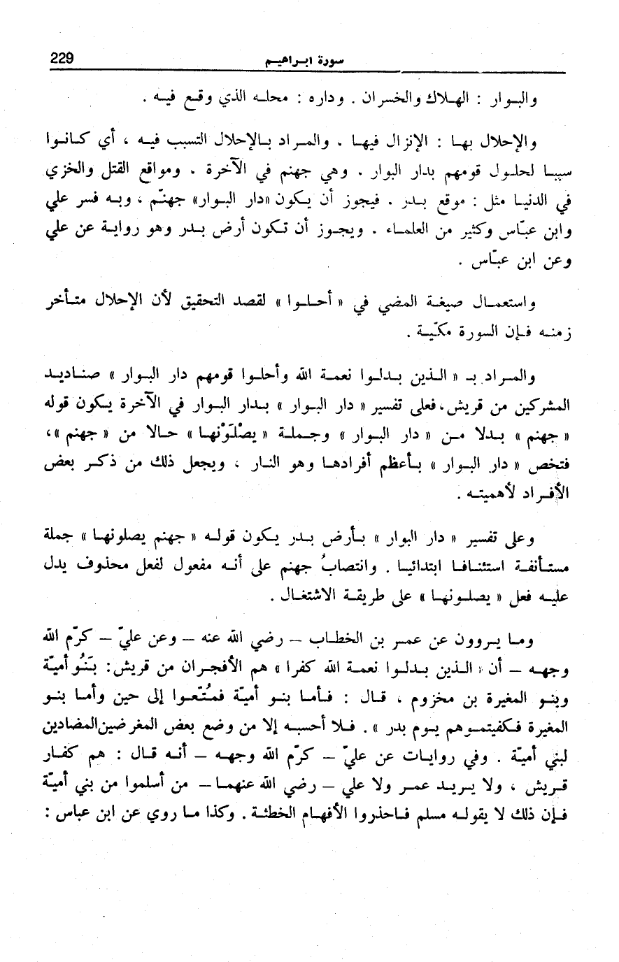 وَالْإِحْلَالُ بِهَا الْإِنْزَالُ فِيهَا، وَالْمُرَادُ بِالْإِحْلَالِ التَّسَبُّبُ فِيهِ، أَيْ كَانُوا سَبَبًا لِحُلُولِ قَوْمِهِمْ بِدَارِ الْبَوَارِ، وَهِيَ جَهَنَّمُ فِي الْآخِرَةِ، وَمَوَاقِعُ الْقَتْلِ وَالْخِزْيِ فِي الدُّنْيَا مِثْلُ: مَوْقِعِ بَدْرٍ، فَيَجُوزُ أَنْ يَكُونَ دارَ الْبَوارِ جَهَنَّمَ، وَبِهِ فَسَّرَ عَلِيٌّ وَابْنُ عَبَّاسٍ وَكَثِيرٌ مِنَ الْعُلَمَاءِ، وَيَجُوزُ أَنْ تَكُونَ أَرْضَ بَدْرٍ وَهُوَ رِوَايَةٌ عَنْ عَلِيٍّ وَعَنِ ابْنِ عَبَّاسٍ.