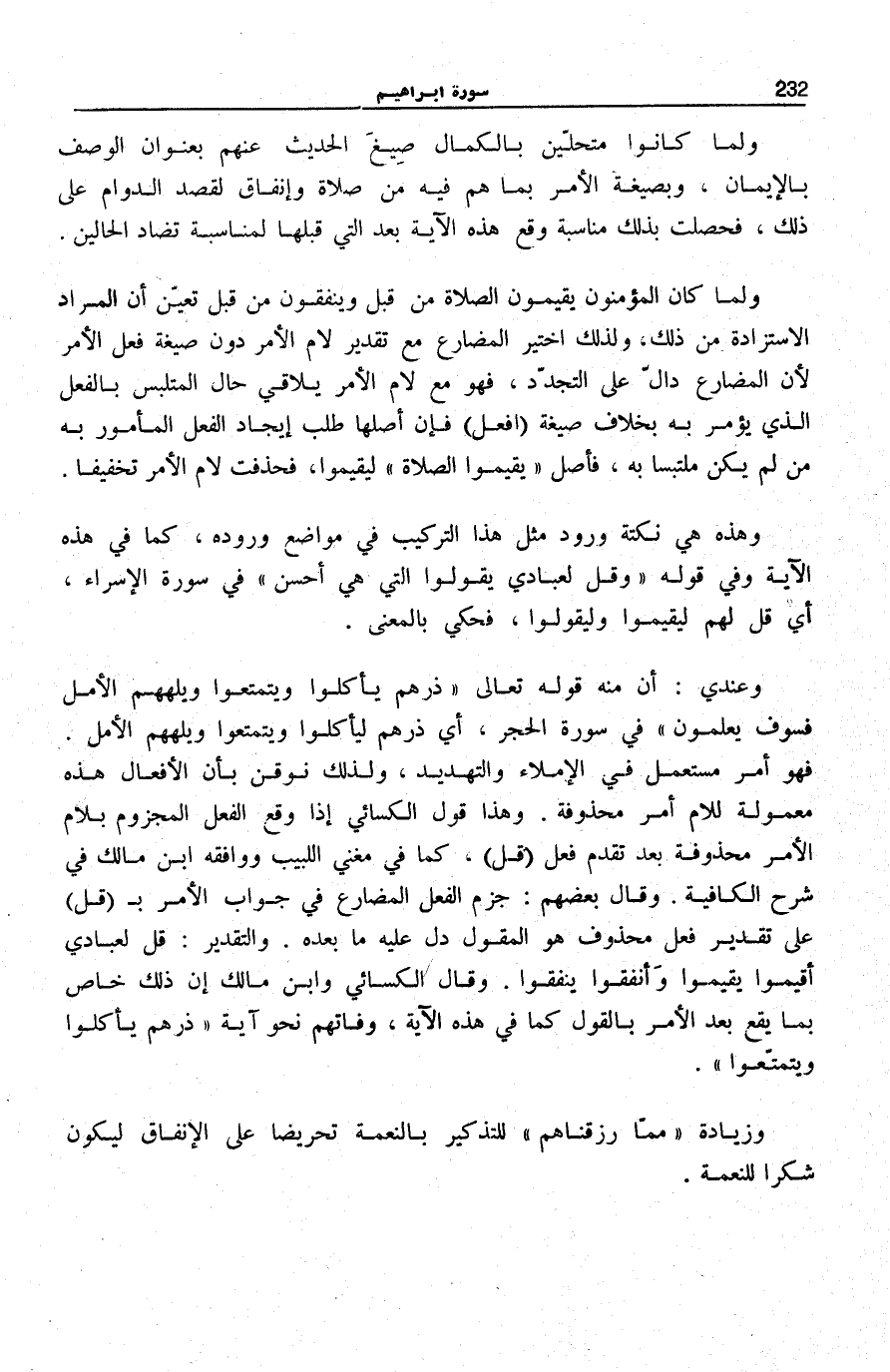 وَعِنْدِي: أَنَّ مِنْهُ قَوْلَهُ تَعَالَى: ذَرْهُمْ يَأْكُلُوا وَيَتَمَتَّعُوا وَيُلْهِهِمُ الْأَمَلُ فَسَوْفَ يَعْلَمُونَ فِي سُورَةِ الْحِجْرِ [3] ، أَيْ ذَرْهُمْ لِيَأْكُلُوا وَيَتَمَتَّعُوا وَيُلْهِهِمُ الْأَمَلُ. فَهُوَ أَمْرٌ مُسْتَعْمَلٌ فِي الْإِمْلَاءِ وَالتَّهْدِيدِ، وَلِذَلِكَ نُوقِنُ بِأَنَّ الْأَفْعَالَ هَذِهِ مَعْمُولَةٌ لِلَامِ أَمْرٍ مَحْذُوفَةٍ. وَهَذَا قَوْلُ الْكِسَائِيِّ إِذَا وَقَعَ الْفِعْلُ الْمَجْزُومُ بلام الْأَمر محذوفة بَعْدَ تَقَدُّمِ فِعْلِ قُلْ، كَمَا فِي «مُغْنِي اللَّبِيبِ» وَوَافَقَهُ ابْنُ مَالِكٍ فِي «شَرْحِ الْكَافِيَةِ» . وَقَالَ بَعْضُهُمْ: جَزْمُ الْفِعْلِ الْمُضَارِعِ فِي جَوَابِ الْأَمْرِ بِ قُلْ عَلَى تَقْدِيرِ فِعْلٍ مَحْذُوفٍ هُوَ الْمَقُولُ دَلَّ عَلَيْهِ مَا بَعْدَهُ. وَالتَّقْدِيرُ: قُلْ لِعِبَادِي أَقِيمُوا يُقِيمُوا وَأَنْفِقُوا يُنْفِقُوا. وَقَالَ الْكِسَائِيُّ وَابْنُ مَالِكٍ إِنَّ ذَلِكَ خَاصٌّ بِمَا يَقَعُ بَعْدَ الْأَمْرِ بِالْقَوْلِ كَمَا فِي هَذِهِ الْآيَةِ، وَفَاتَهُمْ نَحْوُ آيَةِ ذَرْهُمْ يَأْكُلُوا وَيَتَمَتَّعُوا.