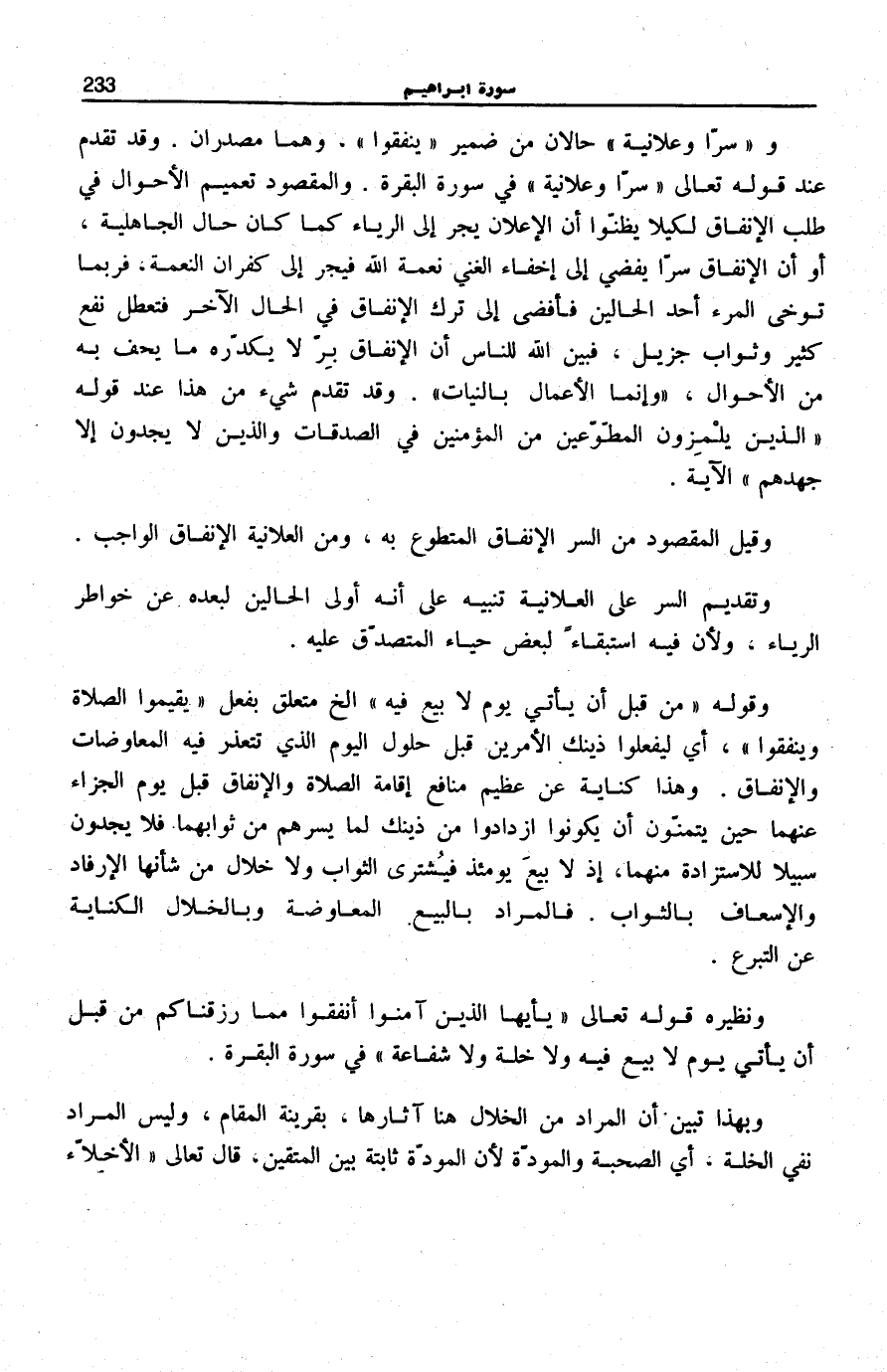 وَقَوْلُهُ: مِنْ قَبْلِ أَنْ يَأْتِيَ يَوْمٌ لَا بَيْعٌ فِيهِ الْخَ مُتَعَلِّقٌ بِفِعْلِ يُقِيمُوا الصَّلاةَ وَيُنْفِقُوا، أَيْ لِيَفْعَلُوا ذَيْنِكَ الْأَمْرَيْنِ قَبْلَ حُلُولِ الْيَوْمِ الَّذِي تَتَعَذَّرُ فِيهِ الْمُعَاوَضَاتُ وَالْإِنْفَاقُ. وَهَذَا كِنَايَةٌ عَنْ عَظِيمِ مَنَافِعِ إِقَامَةِ الصَّلَاةِ وَالْإِنْفَاقِ قَبْلَ يَوْمِ الْجَزَاءِ عَنْهُمَا حِينَ يَتَمَنَّوْنَ أَنْ يَكُونُوا ازْدَادُوا مِنْ ذَيْنِكَ لِمَا يَسُرُّهُمْ مِنْ ثَوَابِهِمَا فَلَا يَجِدُونَ سَبِيلًا لِلِاسْتِزَادَةِ مِنْهُمَا، إِذْ لَا بَيْعَ يَوْمَئِذٍ فَيُشْتَرَى الثَّوَابُ وَلَا خِلَالَ مِنْ شَأْنِهَا الْإِرْفَادُ وَالْإِسْعَافُ بِالثَّوَابِ.