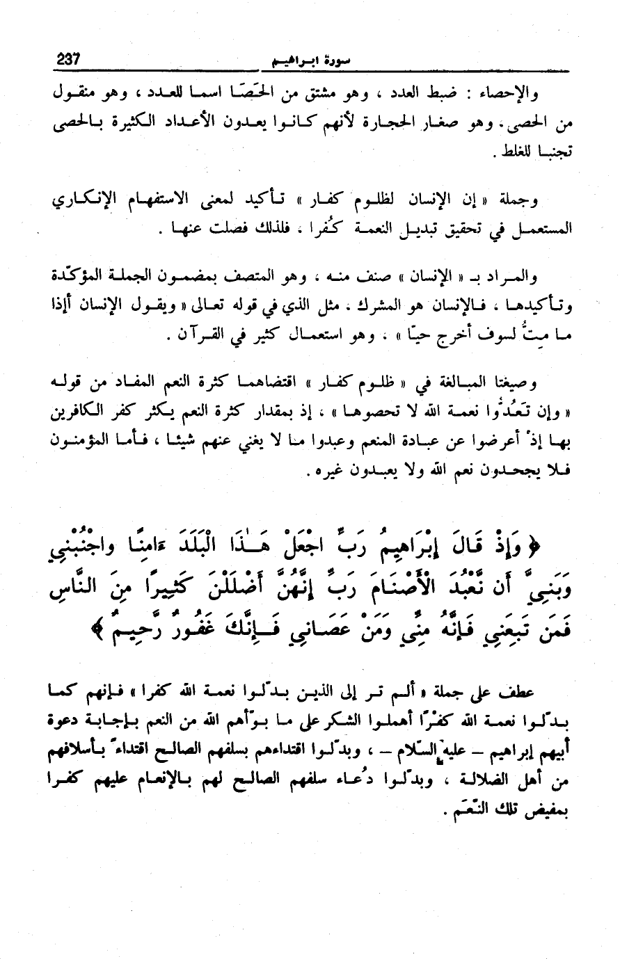 وَإِذْ قالَ إِبْراهِيمُ رَبِّ اجْعَلْ هَذَا الْبَلَدَ آمِناً وَاجْنُبْنِي وَبَنِيَّ أَنْ نَعْبُدَ الْأَصْنامَ (35) رَبِّ إِنَّهُنَّ أَضْلَلْنَ كَثِيراً مِنَ النَّاسِ فَمَنْ تَبِعَنِي فَإِنَّهُ مِنِّي وَمَنْ عَصانِي فَإِنَّكَ غَفُورٌ رَحِيمٌ (36)