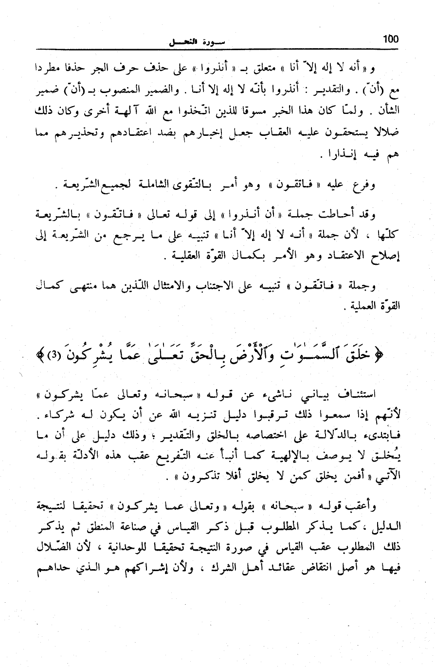 وَ (أَنَّهُ لَا إِلهَ إِلَّا أَنَا) مُتَعَلِّقٌ بِ أَنْذِرُوا عَلَى حَذْفِ حَرْفِ الْجَرِّ حَذْفًا مُطَّرِدًا مَعَ (أَنْ) . وَالتَّقْدِيرُ: أَنْذِرُوا بِأَنَّهُ لَا إِلَهَ إِلَّا أَنَا. وَالضَّمِيرُ الْمَنْصُوبُ بِ (أَنَّ) ضَمِيرُ الشَّأْنِ. وَلَمَّا كَانَ هَذَا الْخَبَرُ مَسُوقًا لِلَّذِينَ اتَّخَذُوا مَعَ اللَّهِ آلِهَةً أُخْرَى وَكَانَ ذَلِكَ ضَلَالًا يَسْتَحِقُّونَ عَلَيْهِ الْعِقَابَ جَعَلَ إِخْبَارَهُمْ بضدّ اعْتِقَادهم وتحذيرهم مِمَّا هُمْ فِيهِ إِنْذَارًا.