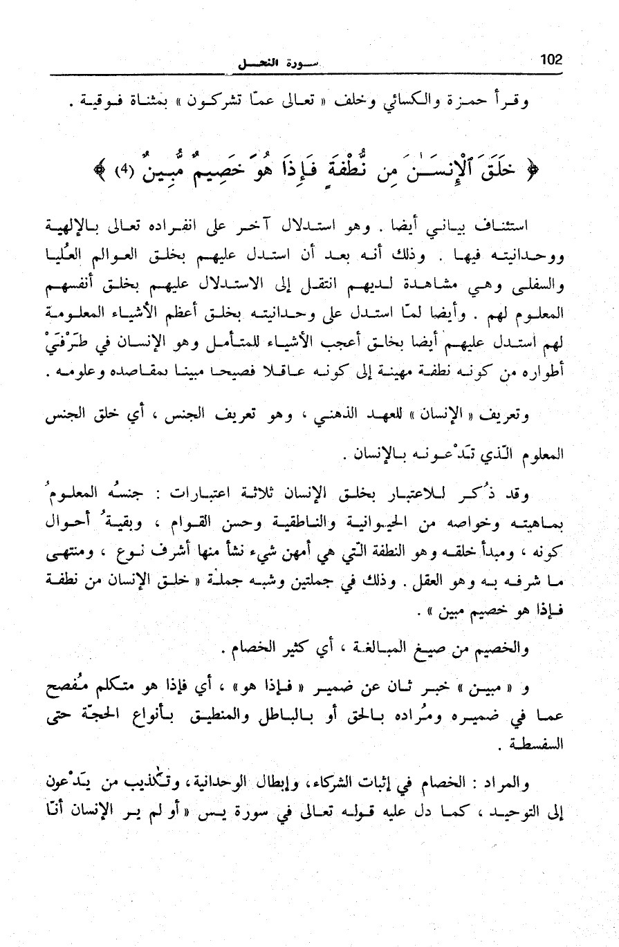 وَقَدْ ذُكِرَ لِلِاعْتِبَارِ بِخَلْقِ الْإِنْسَانِ ثَلَاثَةُ اعْتِبَارَاتٍ: جِنْسُهُ الْمَعْلُومُ بِمَاهِيَّتِهِ وَخَوَاصِّهِ مِنَ الْحَيَوَانِيَّةِ وَالنَّاطِقِيَّةِ وَحُسْنِ الْقَوَامِ، وَبَقِيَّةِ أَحْوَالِ كَوْنِهِ، وَمَبْدَأُ خَلْقِهِ وَهُوَ النُّطْفَةُ الَّتِي هِيَ أَمْهَنُ شَيْءٍ نَشَأَ مِنْهَا أَشْرَفُ نَوْعٍ، وَمُنْتَهَى مَا شَرَّفَهُ بِهِ وَهُوَ الْعَقْلُ. وَذَلِكَ فِي جُمْلَتَيْنِ وَشِبْهِ جُمْلَةٍ خَلَقَ الْإِنْسانَ مِنْ نُطْفَةٍ فَإِذا هُوَ خَصِيمٌ مُبِينٌ.