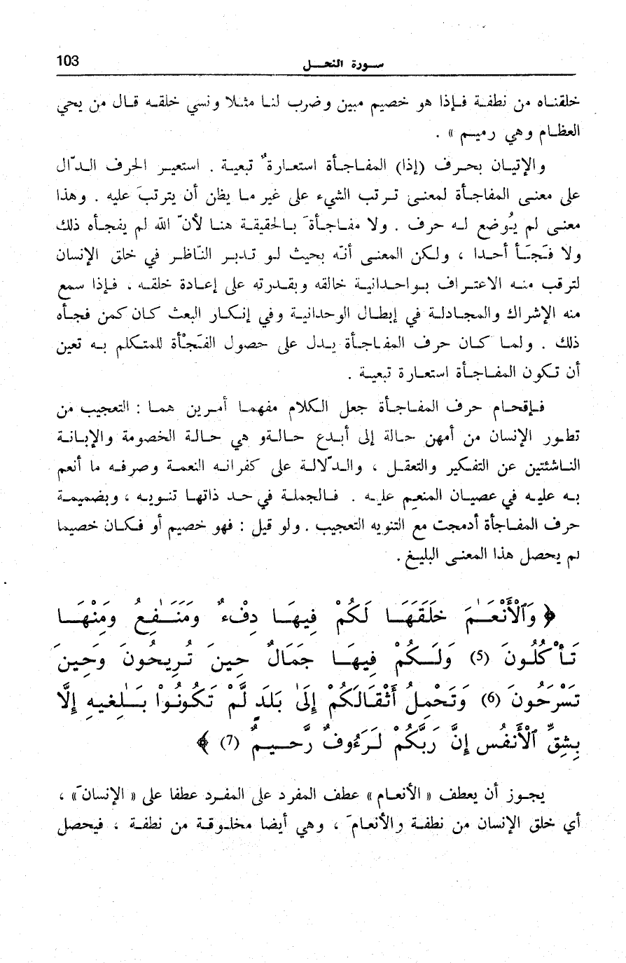 فَإِقْحَامُ حَرْفِ الْمُفَاجَأَةِ جَعَلَ الْكَلَامَ مُفْهِمًا أَمْرَيْنِ هُمَا: التَّعْجِيبُ مِنْ تَطَوُّرِ الْإِنْسَانِ مِنْ أَمْهَنِ حَالَةٍ إِلَى أَبْدَعِ حَالَةٍ وَهِيَ حَالَةُ الْخُصُومَةِ وَالْإِبَانَةِ النَّاشِئَتَيْنِ عَنِ التَّفْكِيرِ وَالتَّعَقُّلِ، وَالدَّلَالَةِ عَلَى كُفْرَانِهِ النِّعْمَةَ وَصَرْفِهِ مَا أَنْعَمَ بِهِ عَلَيْهِ فِي عِصْيَانِ الْمُنْعِمِ عَلَيْهِ. فَالْجُمْلَةُ فِي حَدِّ ذَاتِهَا تَنْوِيهٌ، وَبِضَمِيمَةِ حَرْفِ الْمُفَاجَأَةِ أُدْمِجَتْ مَعَ التَّنْوِيهِ التَّعْجِيبِ. وَلَوْ قِيلَ: فَهُوَ خَصِيمٌ أَوْ فَكَانَ خَصِيمًا لَمْ يَحْصُلْ هَذَا الْمَعْنى البليغ.