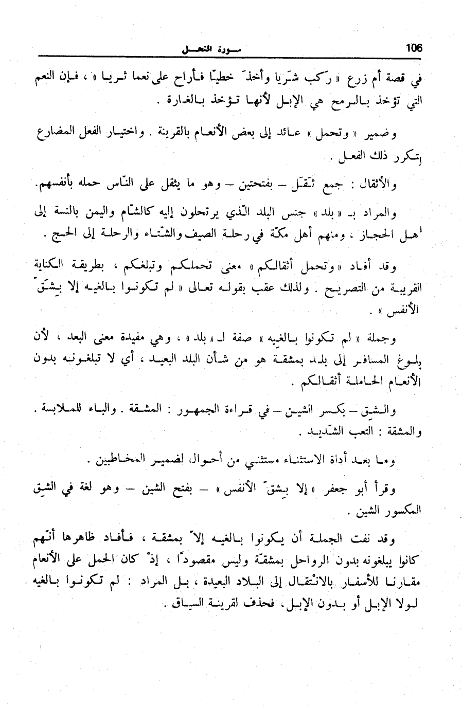 وَقَدْ نَفَتِ الْجُمْلَةُ أَنْ يَكُونُوا بَالِغَيْهِ إِلَّا بِمَشَقَّةٍ، فَأَفَادَ ظَاهِرُهَا أَنَّهُمْ كَانُوا يَبْلُغُونَهُ بِدُونِ الرَّوَاحِلِ بِمَشَقَّةٍ وَلَيْسَ مَقْصُودًا، إِذْ كَانَ الْحَمْلُ عَلَى الْأَنْعَامِ مُقَارِنًا لِلْأَسْفَارِ بِالِانْتِقَالِ إِلَى الْبِلَادِ الْبَعِيدَةِ، بَلِ الْمُرَادُ: لَمْ تَكُونُوا بَالِغَيْهِ لَوْلَا الْإِبِلُ أَوْ بِدُونِ الْإِبِلِ، فَحُذِفَ لِقَرِينَةِ السِّيَاقِ.