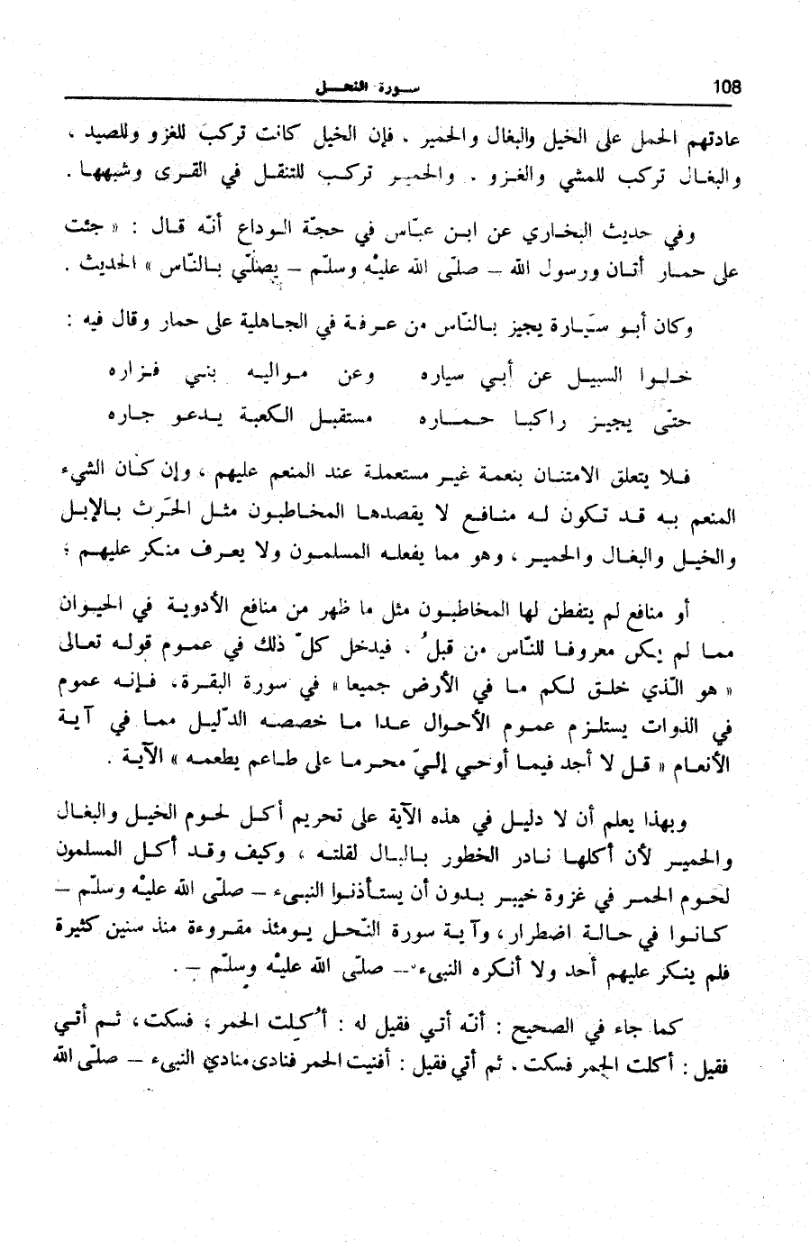 وَبِهَذَا يُعْلَمُ أَنْ لَا دَلِيلَ فِي هَذِهِ الْآيَةِ عَلَى تَحْرِيمِ أَكَلِ لُحُومِ الْخَيْلِ وَالْبِغَالِ وَالْحَمِيرِ لِأَنَّ أَكْلَهَا نَادِرُ الْخُطُورِ بِالْبَالِ لِقِلَّتِهِ، وَكَيْفَ وَقَدْ أَكَلَ الْمُسْلِمُونَ لُحُومَ الْحُمُرِ فِي غَزْوَةِ خَيْبَرَ بِدُونِ أَنْ يَسْتَأْذِنُوا النَّبِيءَ صَلَّى اللهُ عَلَيْهِ وَسَلَّمَ كَانُوا فِي حَالَةِ اضْطِرَارٍ، وَآيَةُ سُورَةِ النَّحْلِ يَوْمَئِذٍ مَقْرُوءَةٌ مُنْذُ سِنِينَ كَثِيرَةٍ فَلَمْ يُنْكِرْ عَلَيْهِمْ أَحَدٌ وَلَا أَنْكَرَهُ النَّبِيءُ صَلَّى اللهُ عَلَيْهِ وَسَلَّمَ.