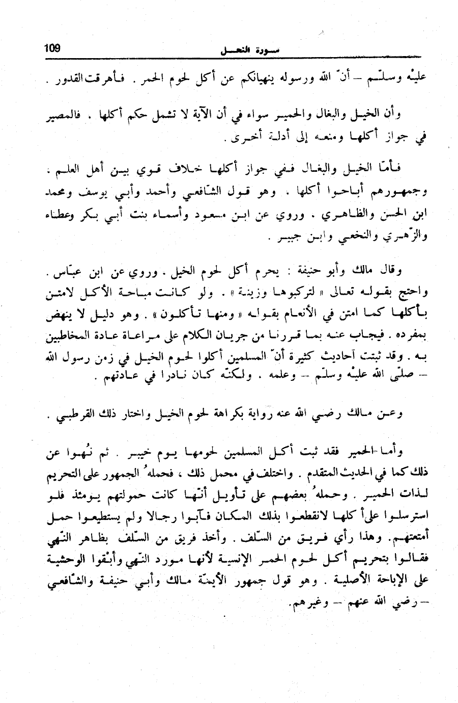 وَقَالَ مَالِكٌ وَأَبُو حَنِيفَةَ: يَحْرُمُ أَكْلُ لُحُومِ الْخَيْلِ، وَرُوِيَ عَنِ ابْنِ عَبَّاسٍ. وَاحْتَجَّ بِقَوْلِهِ تَعَالَى: لِتَرْكَبُوها وَزِينَةً، وَلَوْ كَانَتْ مُبَاحَةَ الْأَكْلِ لَامْتَنَّ بِأَكْلِهَا كَمَا امْتَنَّ فِي الْأَنْعَامِ بِقَوْلِهِ: وَمِنْها تَأْكُلُونَ [سُورَة النَّحْل: 5] . وَهُوَ دَلِيلٌ لَا يَنْهَضُ بِمُفْرَدِهِ. فَيُجَابُ عَنْهُ بِمَا قَرَّرْنَا مِنْ جَرَيَانِ الْكَلَامِ عَلَى مُرَاعَاةِ عَادَةِ الْمُخَاطَبِينَ بِهِ. وَقَدْ ثَبَتَتْ أَحَادِيثُ كَثِيرَةٌ أَنَّ الْمُسْلِمِينَ أَكَلُوا لُحُومَ الْخَيْلِ فِي زَمَنِ رَسُولِ اللَّهِ صَلَّى اللهُ عَلَيْهِ وَسَلَّمَ وَعَلِمَهُ. وَلَكِنَّهُ كَانَ نَادِرًا فِي عَادَتِهِمْ.