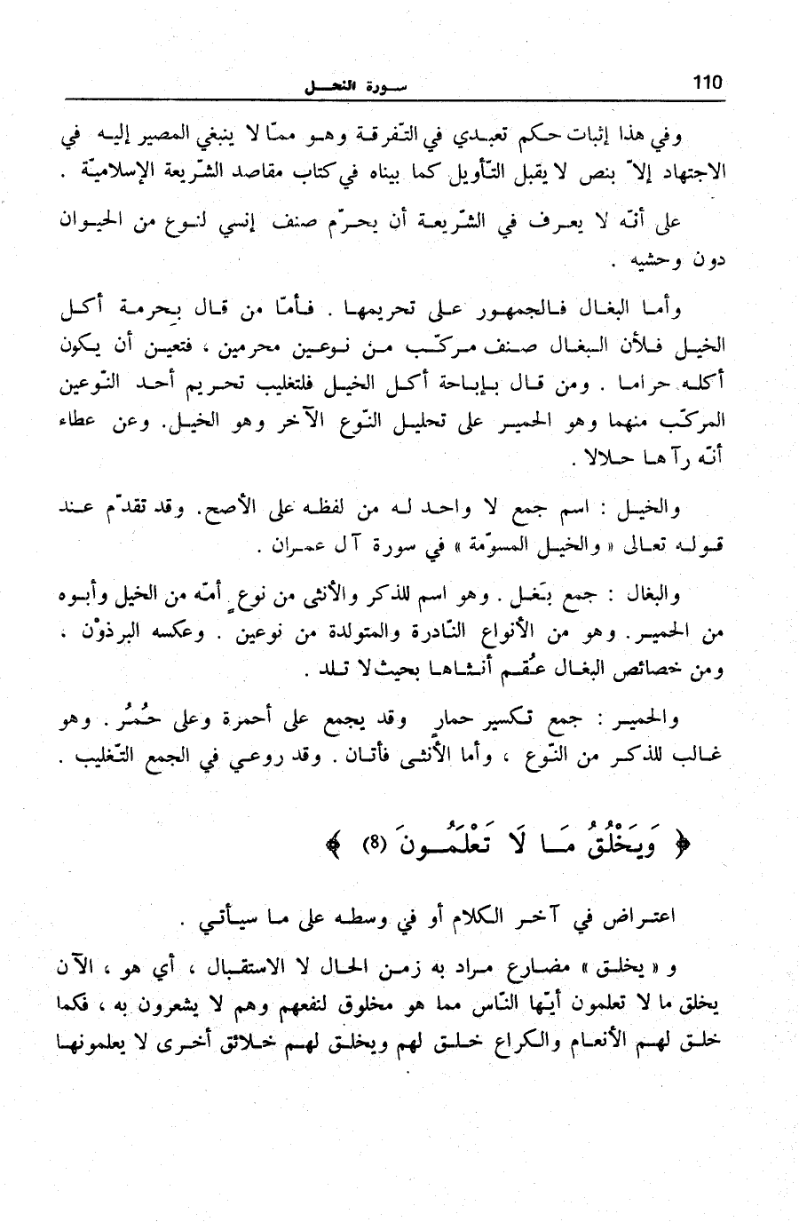 ويَخْلُقُ مُضَارِعٌ مُرَادٌ بِهِ زَمَنُ الْحَالِ لَا الِاسْتِقْبَالِ، أَيْ هُوَ الْآنَ يَخْلُقُ مَا لَا تَعْلَمُونَ أَيُّهَا النَّاسُ مِمَّا هُوَ مَخْلُوقٌ لِنَفْعِهِمْ وَهُمْ لَا يَشْعُرُونَ بِهِ، فَكَمَا خَلَقَ لَهُمُ الْأَنْعَامَ وَالْكُرَاعَ خَلَقَ لَهُمْ وَيَخْلُقُ لَهُمْ خَلَائِقَ أُخْرَى لَا يَعْلَمُونَهَا