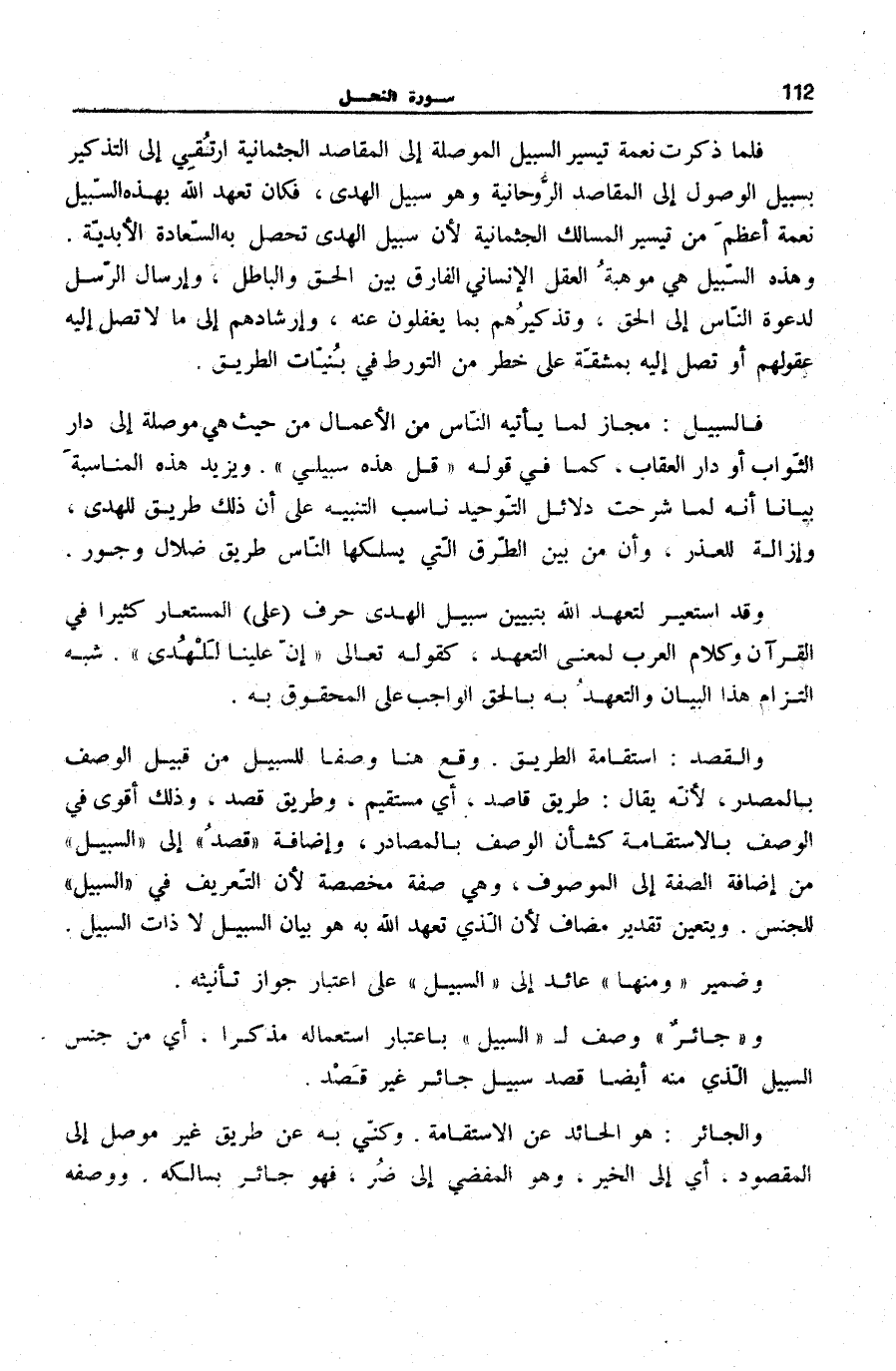 فَالسَّبِيلُ: مَجَازٌ لِمَا يَأْتِيهِ النَّاسُ مِنَ الْأَعْمَالِ مِنْ حَيْثُ هِيَ مُوَصِّلَةٌ إِلَى دَارِ الثَّوَابِ أَوْ دَارِ الْعِقَابِ، كَمَا فِي قَوْلِهِ: قُلْ هذِهِ سَبِيلِي [سُورَة يُوسُف: 108] . وَيَزِيدُ هَذِهِ الْمُنَاسبَة بَيَانا أَنه لِمَا شَرَحْتُ دَلَائِلُ التَّوْحِيدِ نَاسَبَ التَّنْبِيهَ عَلَى أَنَّ ذَلِكَ طَرِيقٌ لِلْهُدَى، وَإِزَالَةٌ لِلْعُذْرِ، وَأَنَّ مِنْ بَيْنِ الطُّرُقِ الَّتِي يَسْلُكُهَا النَّاسُ طَرِيقَ ضَلَالٍ وَجَوْرٍ.