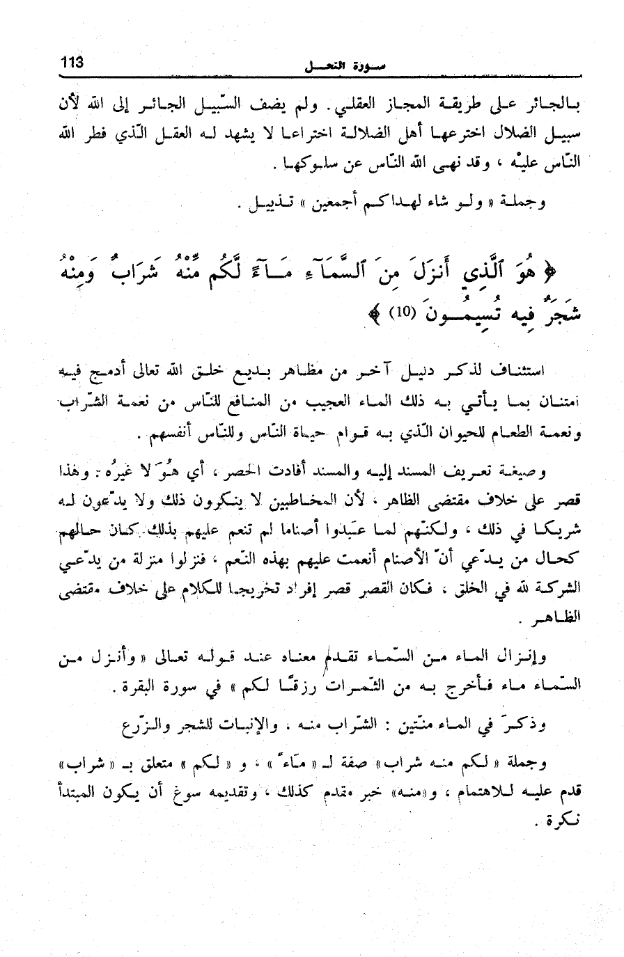 هُوَ الَّذِي أَنْزَلَ مِنَ السَّماءِ مَاءً لَكُمْ مِنْهُ شَرابٌ وَمِنْهُ شَجَرٌ فِيهِ تُسِيمُونَ (10)