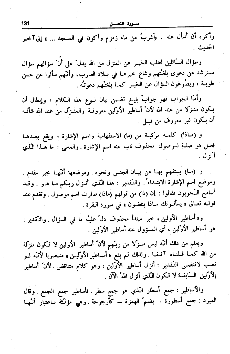 أَنْزَلَ أَسَاطِيرَ الْأَوَّلِينَ، وَهُوَ كَلَامٌ مُتَنَاقِضٌ. لِأَنَّ أَسَاطِيرَ الْأَوَّلِينَ السَّابِقَةَ لَا تَكُونُ الَّذِي أَنْزَلَ اللَّهُ الْآنَ.