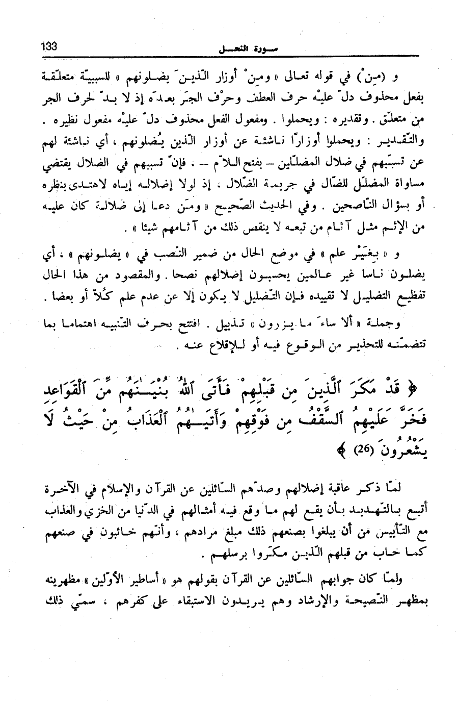 وَ (مِنْ) فِي قَوْلِهِ تَعَالَى: وَمِنْ أَوْزارِ الَّذِينَ يُضِلُّونَهُمْ لِلسَّبَبِيَّةِ مُتَعَلِّقَةٌ بِفِعْلٍ مَحْذُوفٍ دَلَّ عَلَيْهِ حَرْفُ الْعَطْفِ وَحَرْفُ الْجَرِّ بَعْدَهُ إِذْ لَا بُدَّ لِحَرْفِ الْجَرِّ مِنْ مُتَعَلِّقٍ. وَتَقْدِيرُهُ: