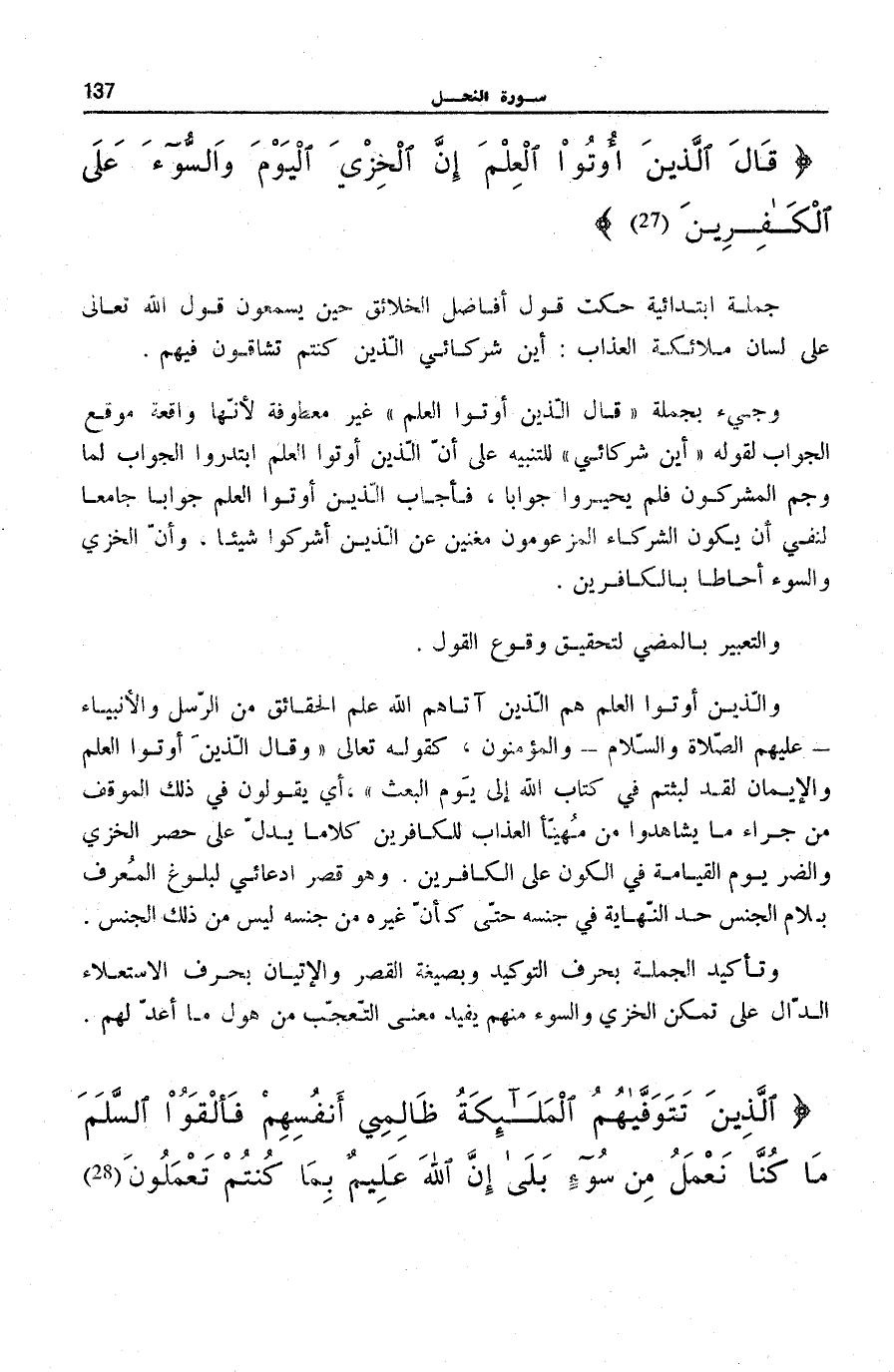 قالَ الَّذِينَ أُوتُوا الْعِلْمَ إِنَّ الْخِزْيَ الْيَوْمَ وَالسُّوءَ عَلَى الْكافِرِينَ جُمْلَةٌ ابْتِدَائِيَّةٌ حَكَتْ قَوْلَ أَفَاضِلِ الْخَلَائِقِ حِينَ يَسْمَعُونَ قَوْلَ اللَّهِ تَعَالَى عَلَى لِسَانِ مَلَائِكَةِ الْعَذَابِ: أَيْنَ شُرَكائِيَ الَّذِينَ كُنْتُمْ تُشَاقُّونَ فِيهِمْ.