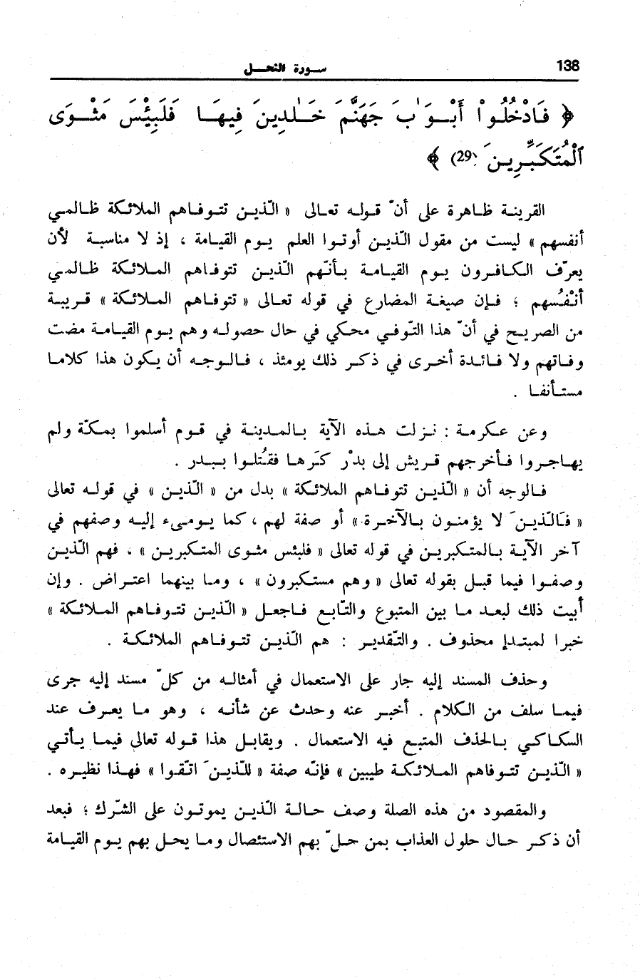 فَالْوَجْهُ أَنَّ الَّذِينَ تَتَوَفَّاهُمُ الْمَلائِكَةُ بَدَلٌ مِنَ الَّذِينَ فِي قَوْلِهِ تَعَالَى: فَالَّذِينَ لَا يُؤْمِنُونَ بِالْآخِرَةِ [سُورَة النَّحْل: 22] أَوْ صِفَةٌ لَهُم، كَمَا يومىء إِلَيْهِ وَصْفُهُمْ فِي آخِرِ الْآيَةِ بِالْمُتَكَبِّرِينَ فِي قَوْلِهِ تَعَالَى: فَلَبِئْسَ مَثْوَى الْمُتَكَبِّرِينَ، فَهُمُ الَّذِينَ وُصِفُوا فِيمَا قَبْلُ بِقَوْلِهِ تَعَالَى: وَهُمْ مُسْتَكْبِرُونَ [سُورَة النَّحْل: 22] ، وَمَا بَيْنَهُمَا اعْتِرَاضٌ. وَإِنْ أَبَيْتَ ذَلِكَ لِبُعْدِ مَا بَيْنَ الْمَتْبُوعِ وَالتَّابِعِ فَاجْعَلِ الَّذِينَ تَتَوَفَّاهُمُ الْمَلائِكَةُ خَبَرًا لِمُبْتَدَأٍ مَحْذُوفٍ. وَالتَّقْدِيرُ: