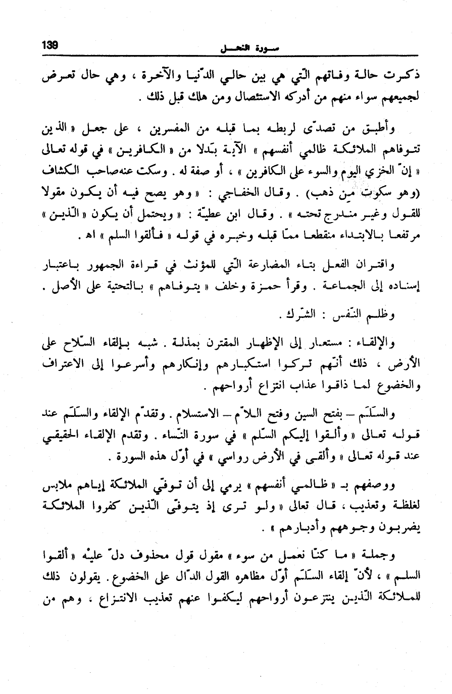 وَأَطْبَقَ مَنْ تَصَدَّى لِرَبْطِهِ بِمَا قَبْلَهُ مِنَ الْمُفَسِّرِينَ، عَلَى جَعْلِ الَّذِينَ تَتَوَفَّاهُمُ الْمَلائِكَةُ ظالِمِي أَنْفُسِهِمْ الْآيَةَ بَدَلًا مِنَ الْكافِرِينَ فِي قَوْلِهِ تَعَالَى: إِنَّ الْخِزْيَ الْيَوْمَ وَالسُّوءَ عَلَى الْكافِرِينَ [سُورَة النَّحْل: 27] ، أَوْ صِفَةً لَهُ. وَسَكَتَ عَنْهُ صَاحِبُ «الْكَشَّافِ» (وَهُوَ سُكُوتٌ مِنْ ذَهَبٍ) . وَقَالَ الْخَفَاجِيُّ: «وَهُوَ يَصِحُّ فِيهِ أَنْ يَكُونَ مَقُولًا لِلْقَوْلِ وَغَيْرَ مُنْدَرِجٍ تَحْتَهُ» . وَقَالَ ابْنُ عَطِيَّةَ: «وَيُحْتَمَلُ أَنْ يَكُونَ الَّذِينَ مُرْتَفِعًا بِالِابْتِدَاءِ مُنْقَطِعًا مِمَّا قَبْلَهُ وَخَبَرُهُ فِي قَوْلِهِ: فَأَلْقَوُا السَّلَمَ [سُورَة النَّحْل: 28] اه.