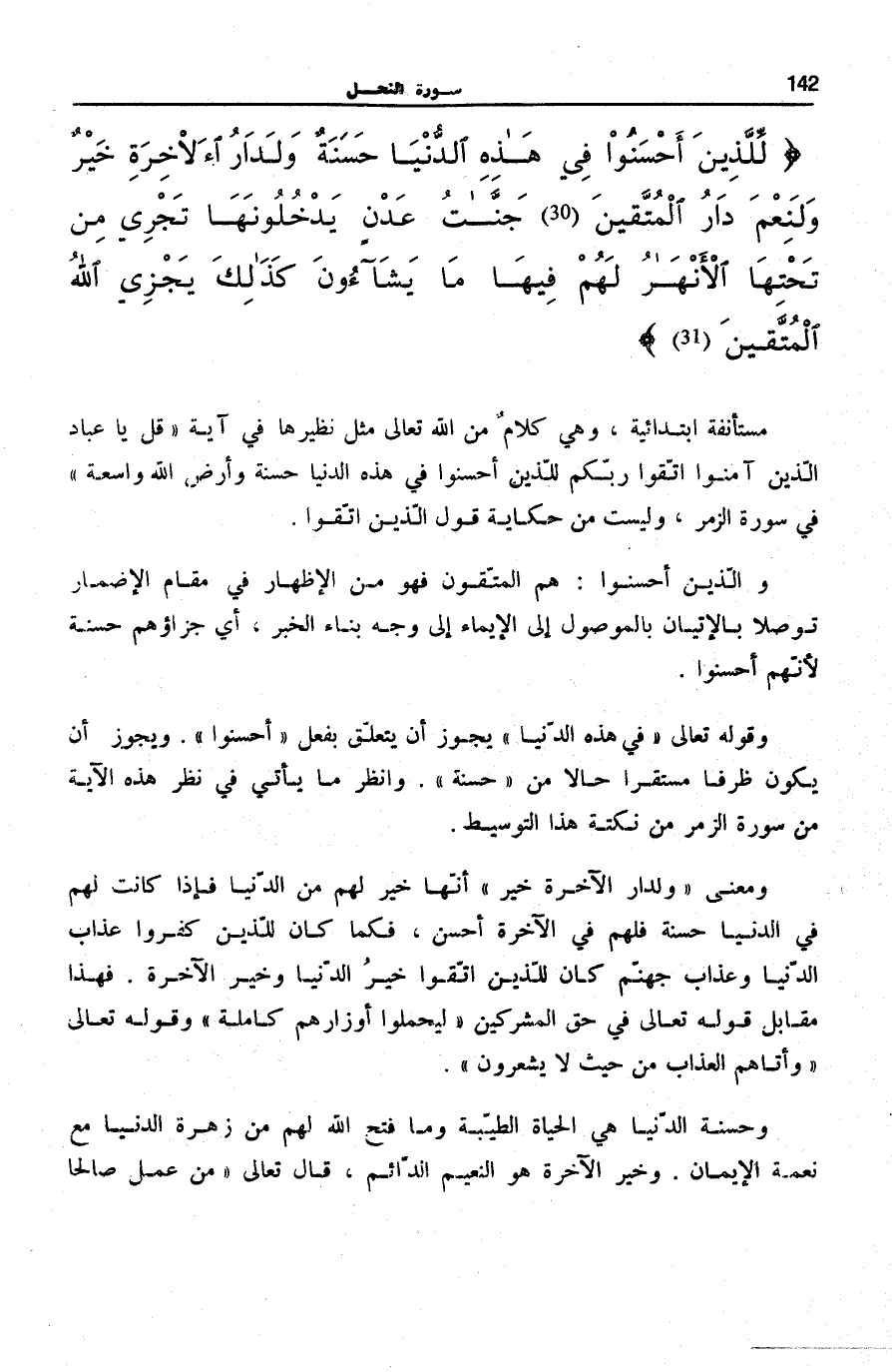 لِلَّذِينَ أَحْسَنُوا فِي هذِهِ الدُّنْيا حَسَنَةٌ وَلَدارُ الْآخِرَةِ خَيْرٌ وَلَنِعْمَ دارُ الْمُتَّقِينَ (30) جَنَّاتُ عَدْنٍ يَدْخُلُونَها تَجْرِي مِنْ تَحْتِهَا الْأَنْهارُ لَهُمْ فِيها مَا يَشاؤُنَ كَذلِكَ يَجْزِي اللَّهُ الْمُتَّقِينَ (31) مُسْتَأْنَفَةٌ ابْتِدَائِيَّةٌ، وَهِيَ كَلَامٌ مِنَ اللَّهِ تَعَالَى مِثْلُ نَظِيرِهَا فِي آيَةِ قُلْ يَا عِبادِ الَّذِينَ آمَنُوا اتَّقُوا رَبَّكُمْ لِلَّذِينَ أَحْسَنُوا فِي هذِهِ الدُّنْيا حَسَنَةٌ وَأَرْضُ اللَّهِ واسِعَةٌ فِي سُورَةِ الزُّمَرِ [10] ، وَلَيْسَتْ مِنْ حِكَايَةِ قَوْلِ الَّذِينَ اتَّقَوْا.