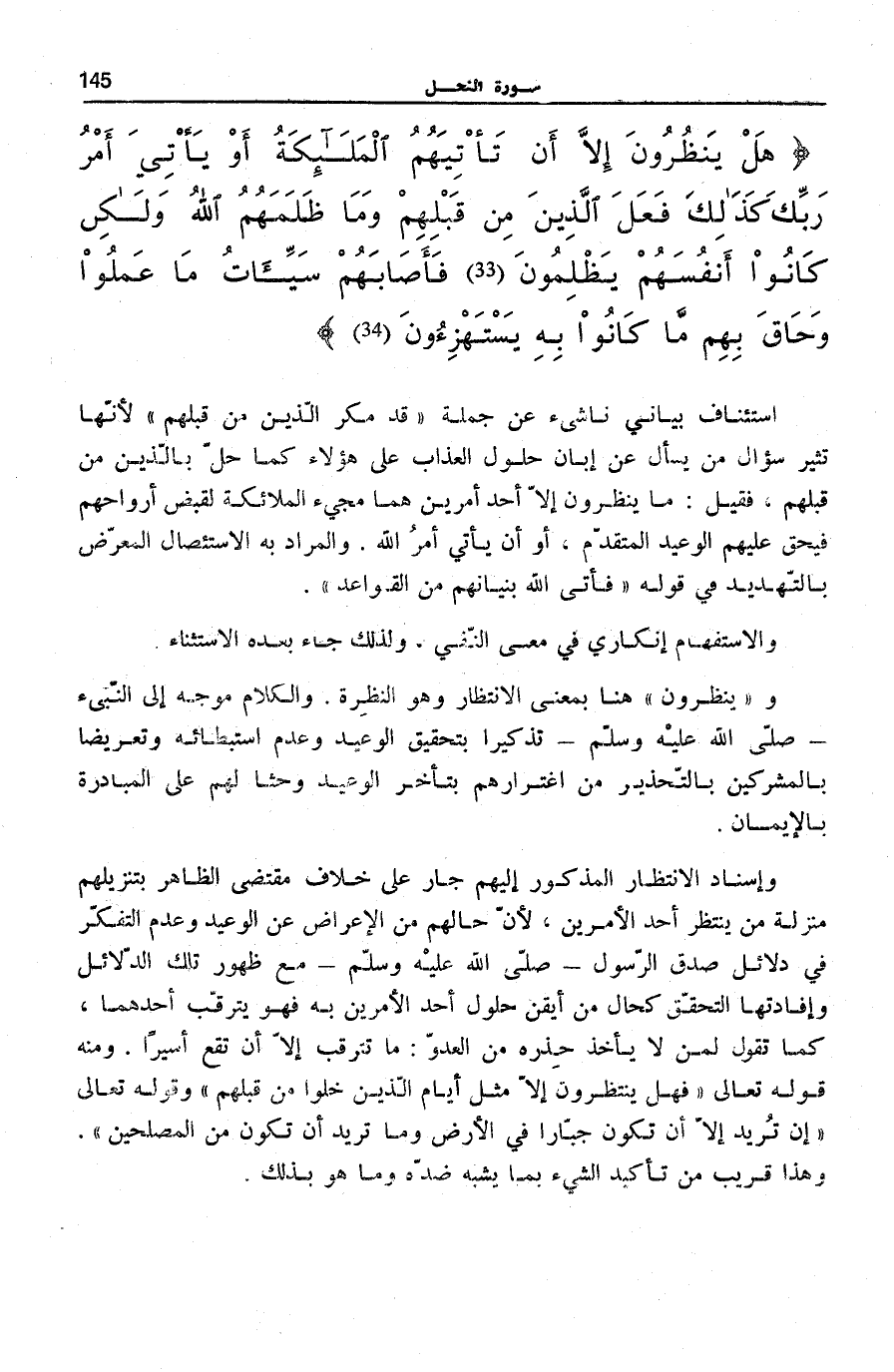 هَلْ يَنْظُرُونَ إِلاَّ أَنْ تَأْتِيَهُمُ الْمَلائِكَةُ أَوْ يَأْتِيَ أَمْرُ رَبِّكَ كَذلِكَ فَعَلَ الَّذِينَ مِنْ قَبْلِهِمْ وَما ظَلَمَهُمُ اللَّهُ وَلكِنْ كانُوا أَنْفُسَهُمْ يَظْلِمُونَ (33) فَأَصابَهُمْ سَيِّئاتُ مَا عَمِلُوا وَحاقَ بِهِمْ مَا كانُوا بِهِ يَسْتَهْزِؤُنَ (34)