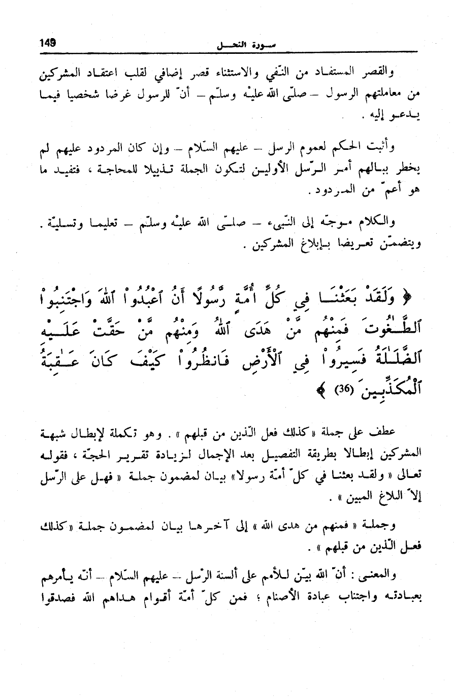 عَطْفٌ عَلَى جُمْلَةِ كَذلِكَ فَعَلَ الَّذِينَ مِنْ قَبْلِهِمْ [سُورَة النَّحْل: 35] . وَهُوَ تَكْمِلَةٌ لِإِبْطَالِ شُبْهَةِ الْمُشْرِكِينَ إِبْطَالًا بِطَرِيقَةِ التَّفْصِيلِ بَعْدَ الْإِجْمَالِ لِزِيَادَةِ تَقْرِيرِ الْحُجَّةِ، فَقَوْلُهُ تَعَالَى: وَلَقَدْ بَعَثْنا فِي كُلِّ أُمَّةٍ بَيَانٌ لِمَضْمُونِ جُمْلَةِ فَهَلْ عَلَى الرُّسُلِ إِلَّا الْبَلاغُ الْمُبِينُ [النَّحْل: 35] .