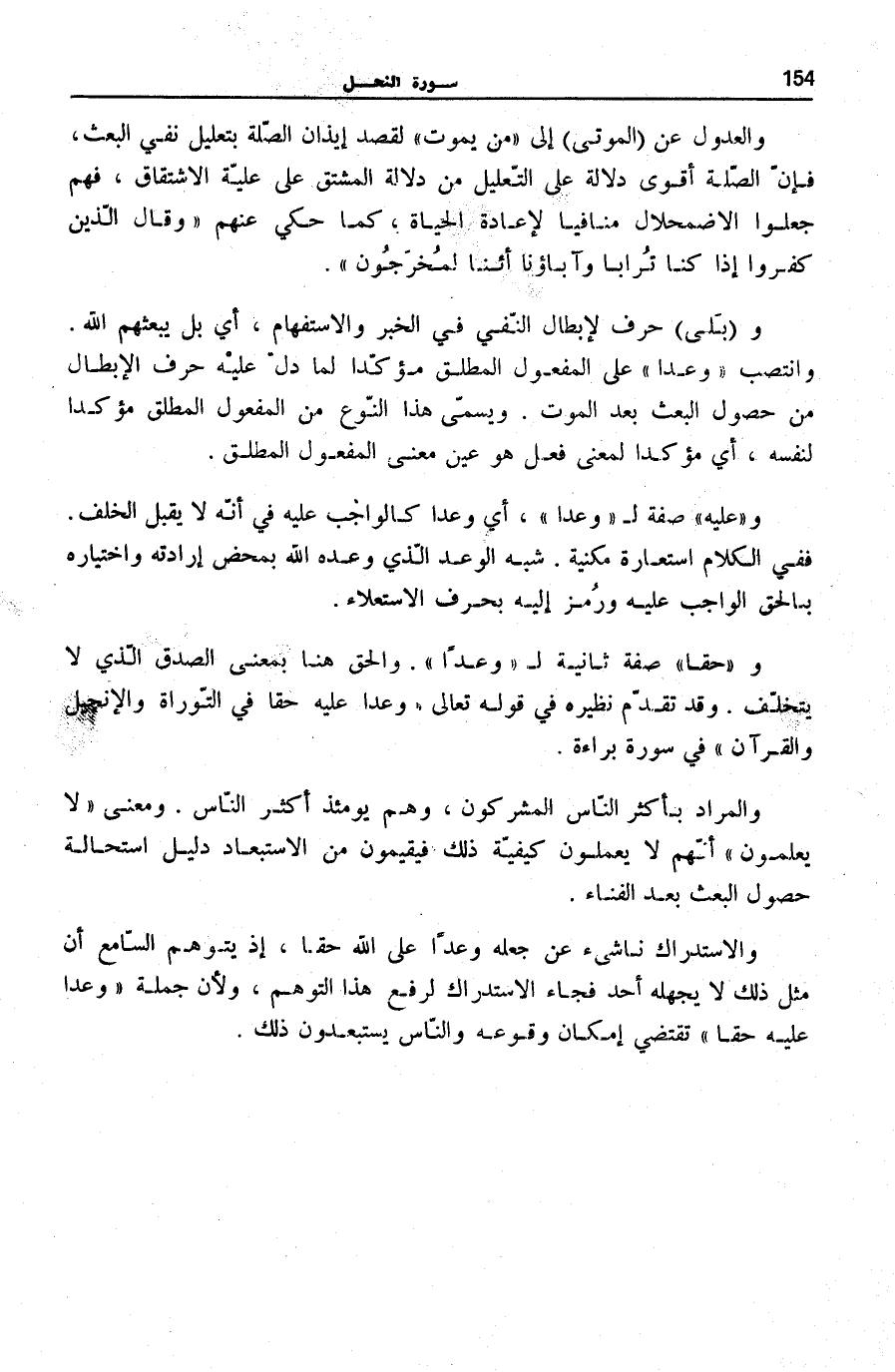 وبَلى حَرْفٌ لِإِبْطَالِ النَّفْيِ فِي الْخَبَرِ وَالِاسْتِفْهَامِ، أَيْ بَلْ يَبْعَثُهُمُ اللَّهُ. وَانْتَصَبَ وَعْداً عَلَى الْمَفْعُولِ الْمُطْلَقِ مُؤَكِّدًا لِمَا دَلَّ عَلَيْهِ حَرْفُ الْإِبْطَالِ مِنْ حُصُولِ الْبَعْثِ بَعْدَ الْمَوْتِ. وَيُسَمَّى هَذَا النَّوْعُ مِنَ الْمَفْعُولِ الْمُطْلَقِ مُؤَكِّدًا لِنَفْسِهِ، أَيْ مُؤَكِّدًا لِمَعْنَى فِعْلٍ هُوَ