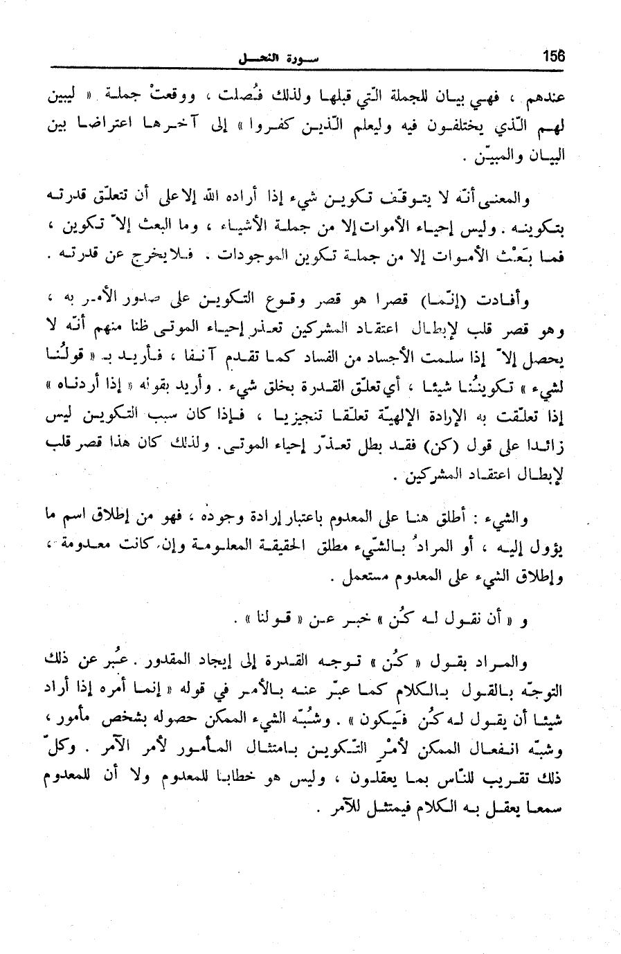 وَأَفَادَتْ إِنَّما قَصْرًا هُوَ قَصْرُ وُقُوعِ التَّكْوِينِ عَلَى صُدُورِ الْأَمْرِ بِهِ، وَهُوَ قَصْرُ قَلْبٍ لِإِبْطَالِ اعْتِقَادِ الْمُشْرِكِينَ تَعَذُّرَ إِحْيَاءِ الْمَوْتَى ظَنًّا مِنْهُمْ أَنَّهُ لَا يَحْصُلُ إِلَّا إِذَا سَلِمَتِ الْأَجْسَادُ مِنَ الْفَسَادِ كَمَا تَقَدَّمَ آنِفًا، فَأُرِيدَ بِ قَوْلُنا لِشَيْءٍ تَكْوِينُنَا شَيْئًا، أَيْ تَعَلُّقُ الْقُدْرَةِ بِخَلْقِ شَيْءٍ. وَأُرِيدَ بِقَوْلِهِ: إِذا أَرَدْناهُ إِذَا تَعَلَّقَتْ بِهِ الْإِرَادَةُ الْإِلَهِيَّةُ تَعَلُّقًا تَنْجِيزِيًا، فَإِذَا كَانَ سَبَبُ التَّكْوِينِ لَيْسَ زَائِدًا عَلَى قَوْلِ كُنْ فَقَدْ بَطَلَ تَعَذُّرُ إِحْيَاءِ الْمَوْتَى. وَلِذَلِكَ كَانَ هَذَا قَصْرَ قَلْبٍ لِإِبْطَالِ اعْتِقَادِ الْمُشْرِكِينَ.
